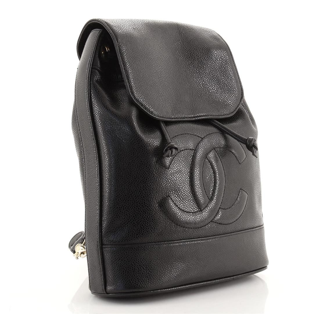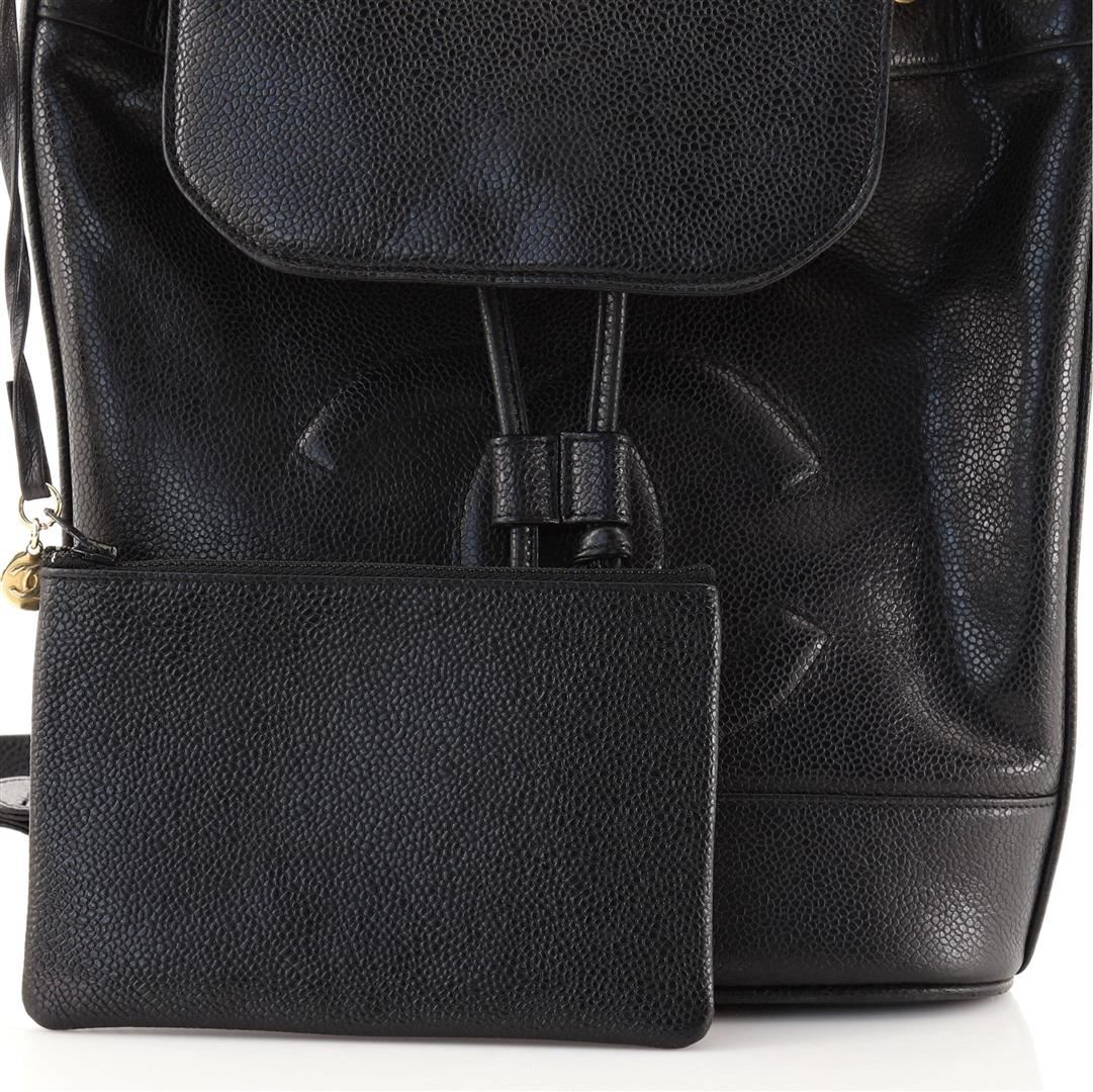 This Chanel Timeless Small Sling Bag is a vintage piece that features black Caviar leather, embossed CC interlocking logo at the front, flap closure on top and drawstring closure underneath, black leather interior lining and black leather shoulder strap w