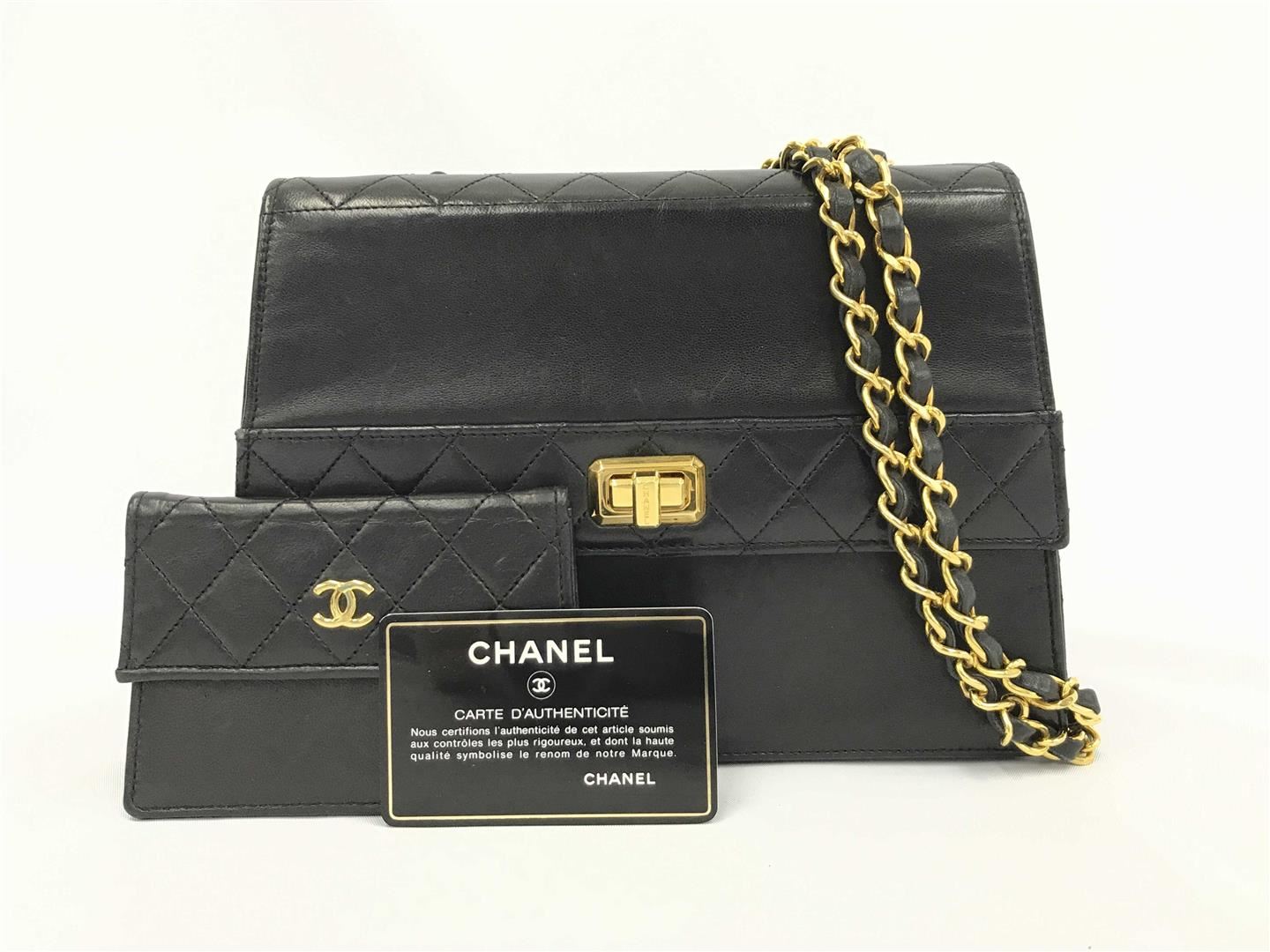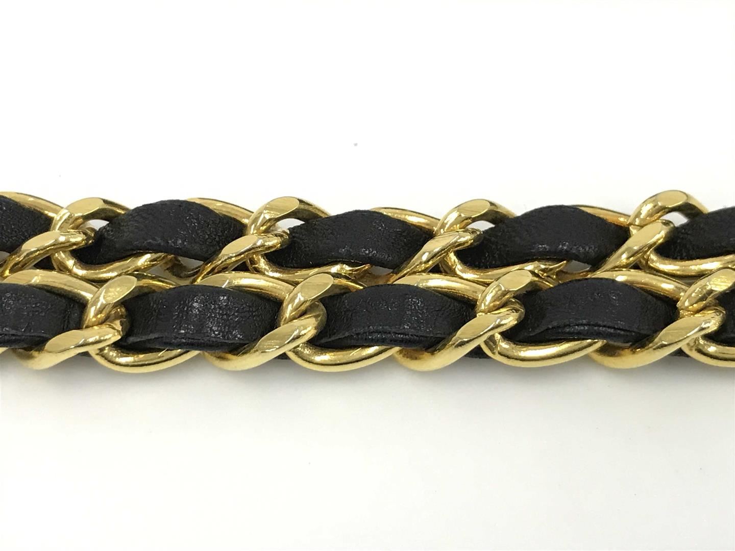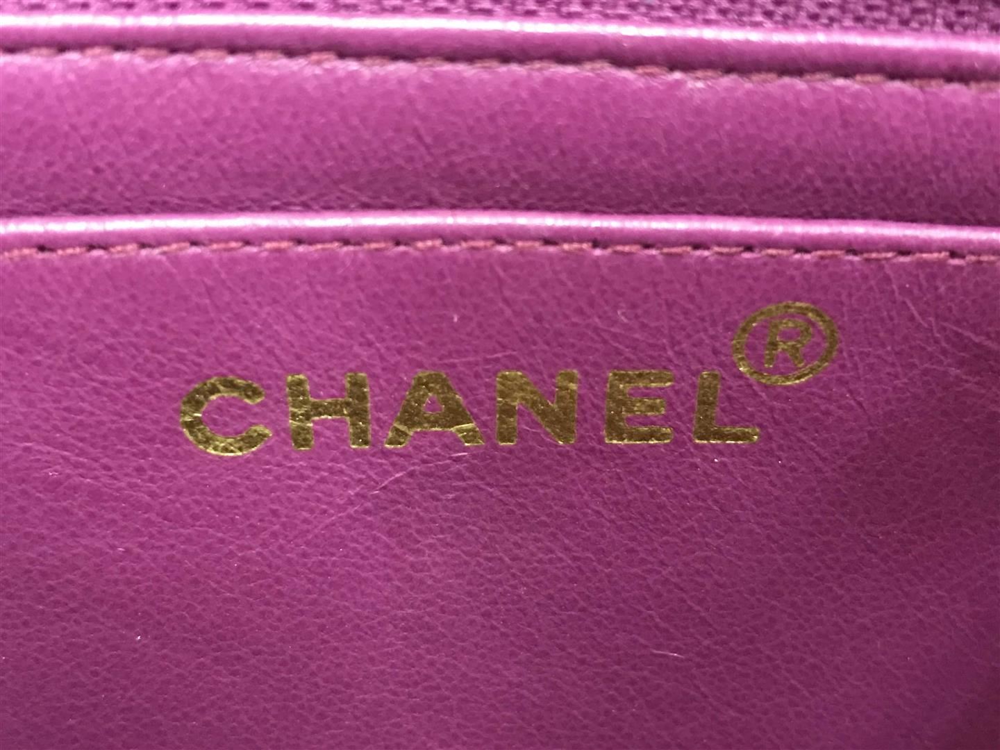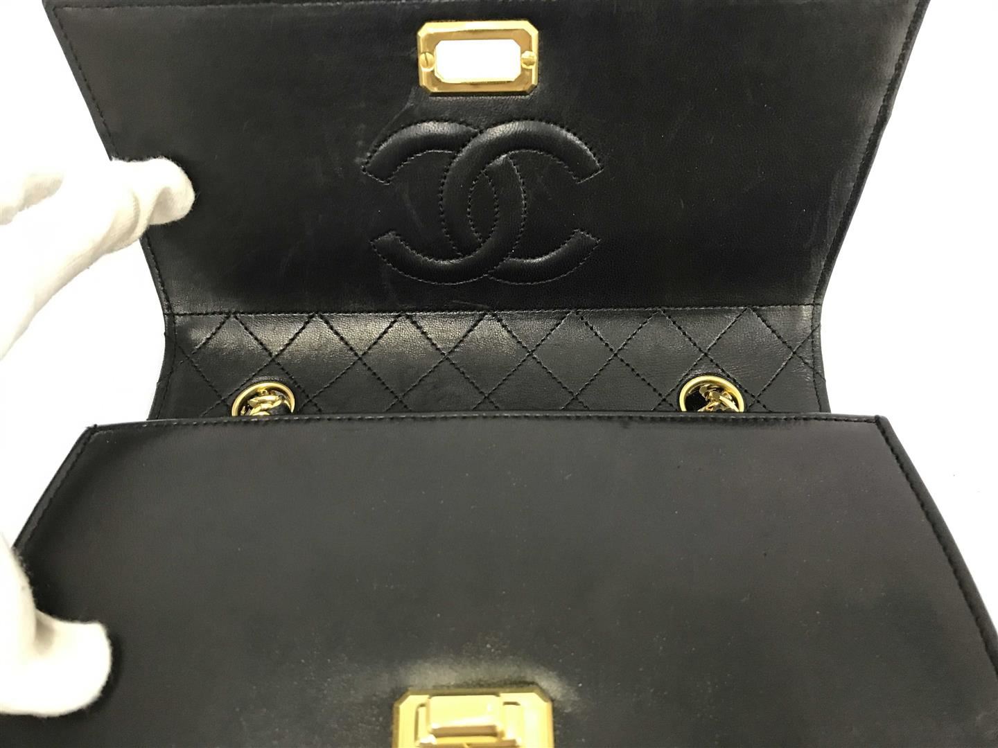 Black Lambskin leather with quilt accent Chanel Trapezoid 2.dium flap bag with gold-tone hardware, interwoven leather and chain shoulder strap, protective feet at base, patch pocket at back, turn-lock closure at the front flap that will open to pink leath