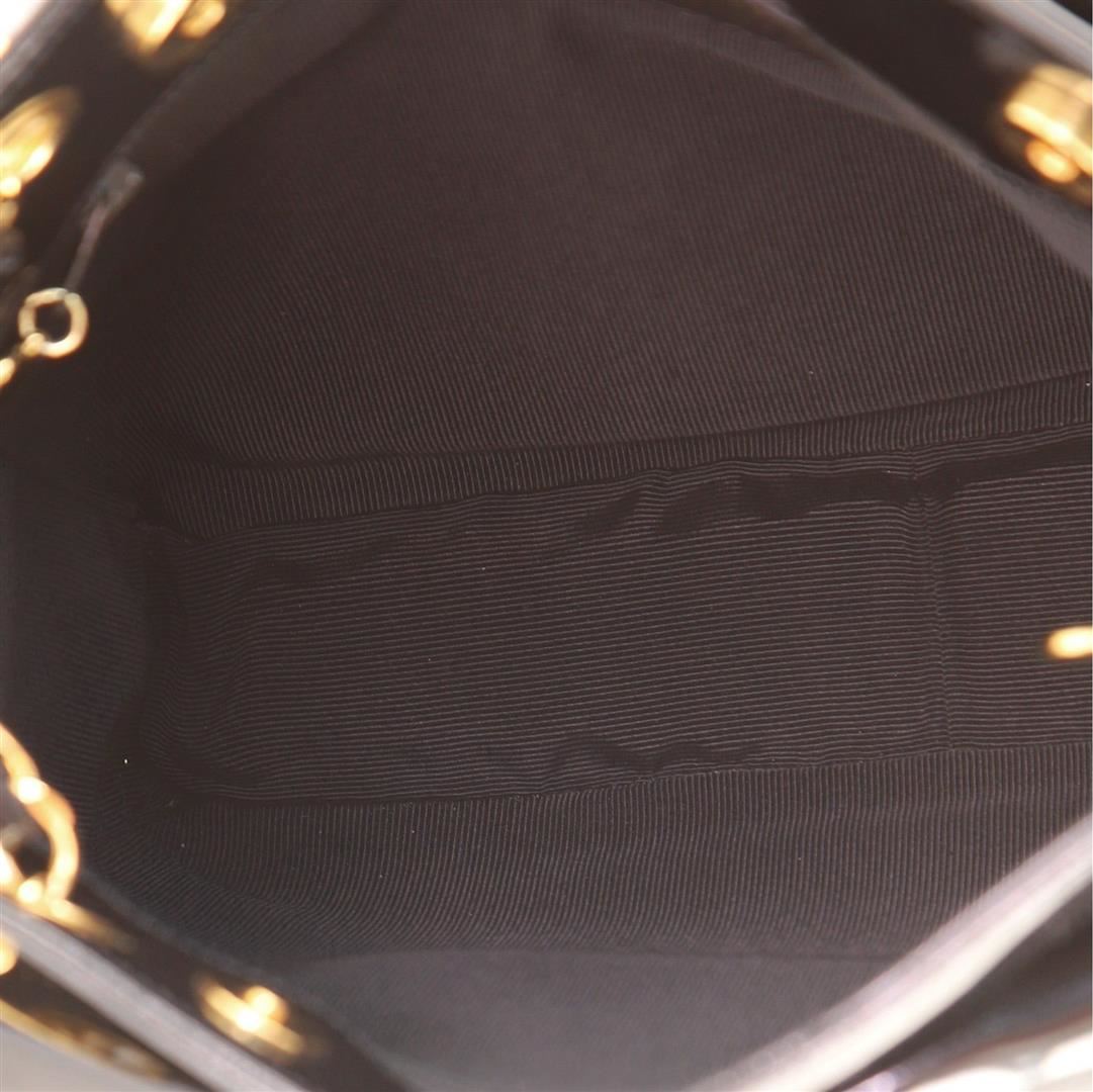 Chanel Vintage Tote Bag features black patent leather body, gold-tone hardware, front pocket with interlocking CC closure, flat back pocket with an embossed interlocking CC logo, two interwoven chain and leather shoulder straps and canvas interior lining.