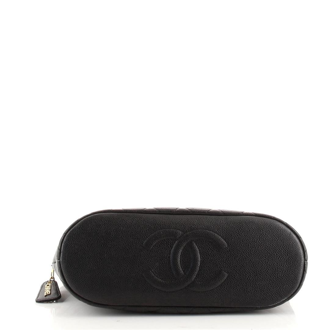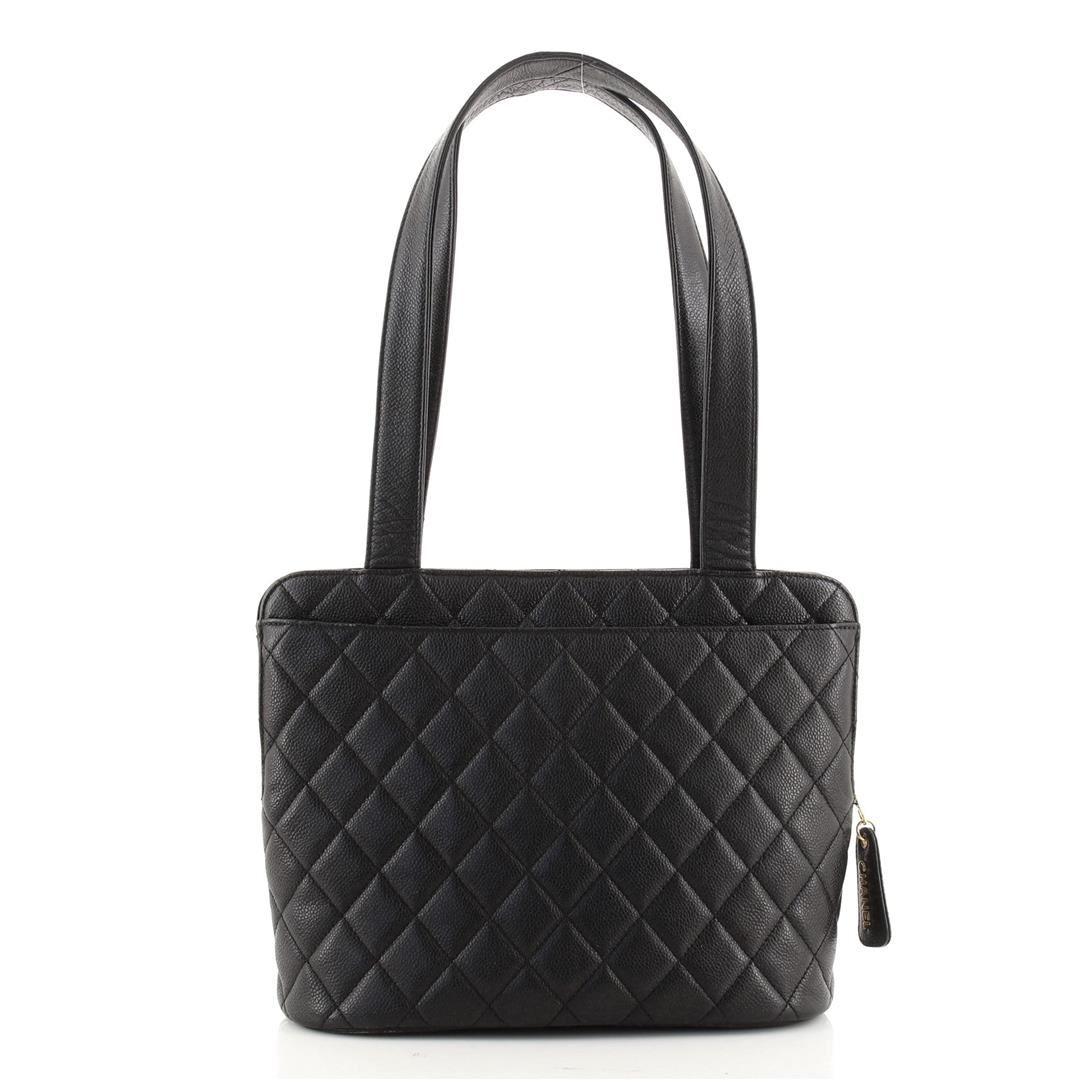 Chanel Vintage Black Quilted Caviar Leather Zip Chain Medium Shoulder Bag features caviar quilted leather, double quilted caviar leather straps, embossed CC interlocking logo on the bottom base, leather lining and gold-tone hardware.