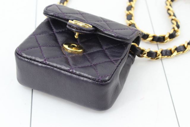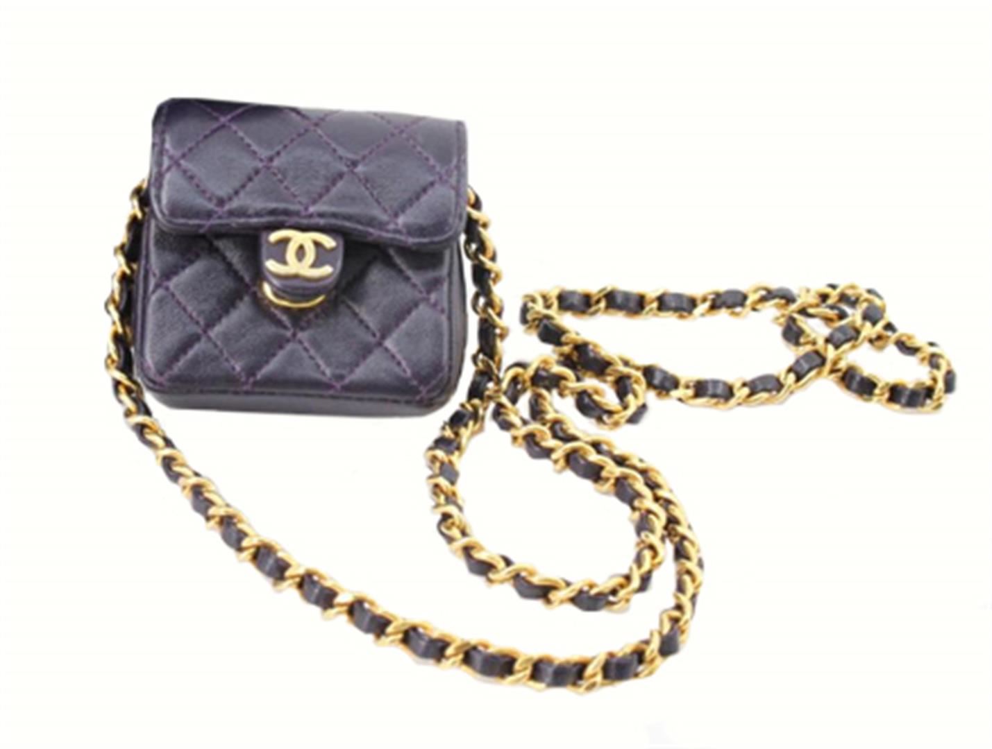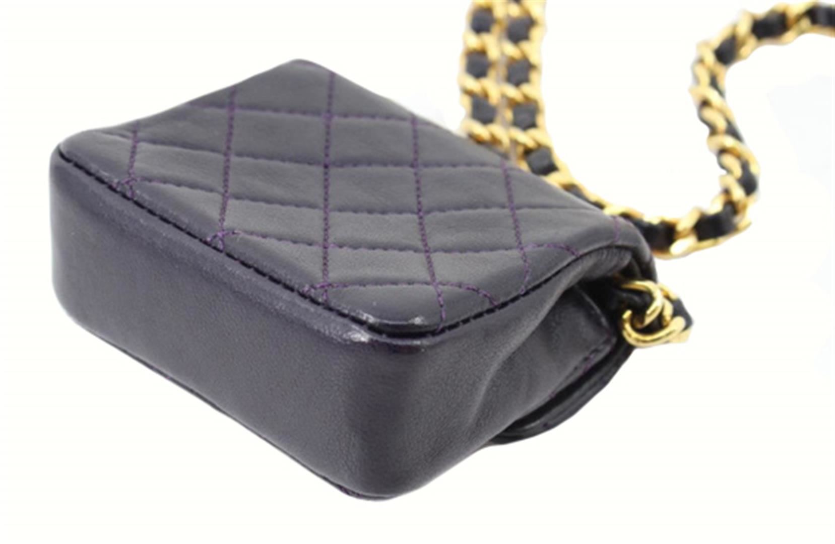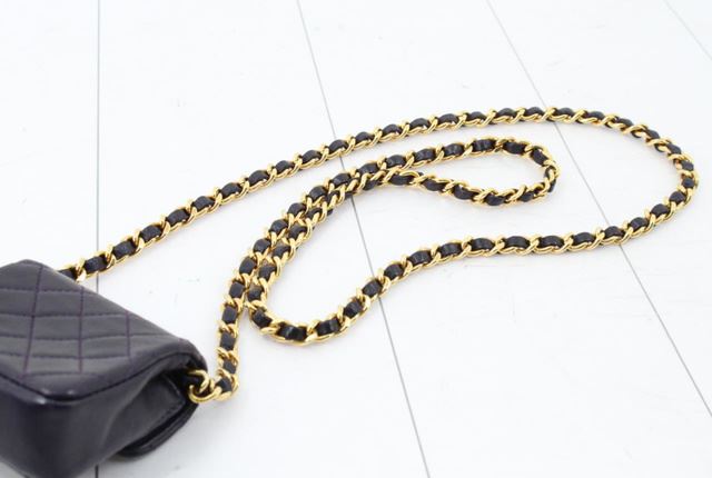 Black quilted leather Chanel vintage Micro Flap bag with gold-tone hardware, single chain-link and leather shoulder strap, tonal leather lining and CC snap closure at front flap. Height: 2.5" Width: 3" Depth: 1" Shoulder Strap Drop: 20"