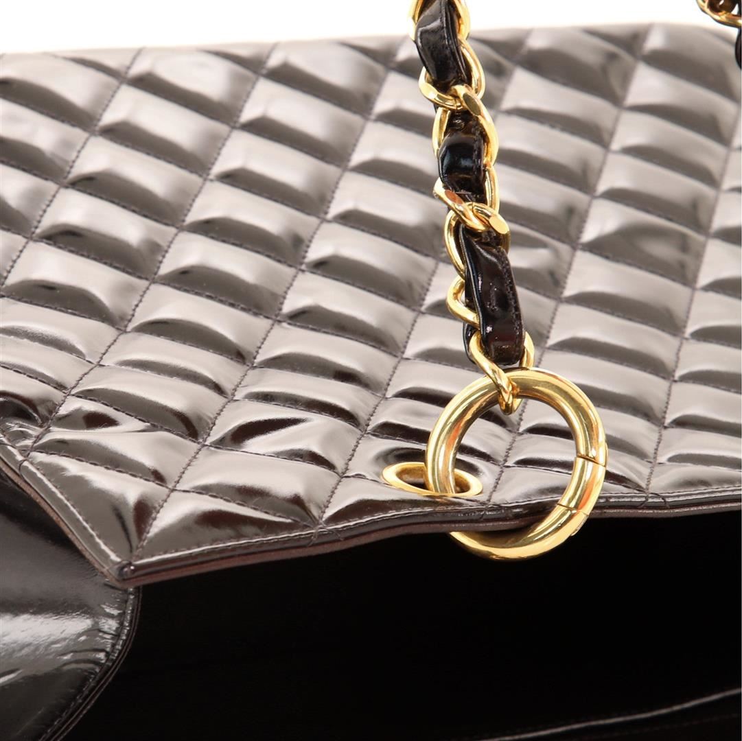 Chanel Vintage Grand Shopping Tote Bag is crafted from black quilted patent leather, and accentuated with gold-tone hardware. It features double chain-link straps and a large stitched 'CC' logo front. This bag is also lined with smooth black leather and h