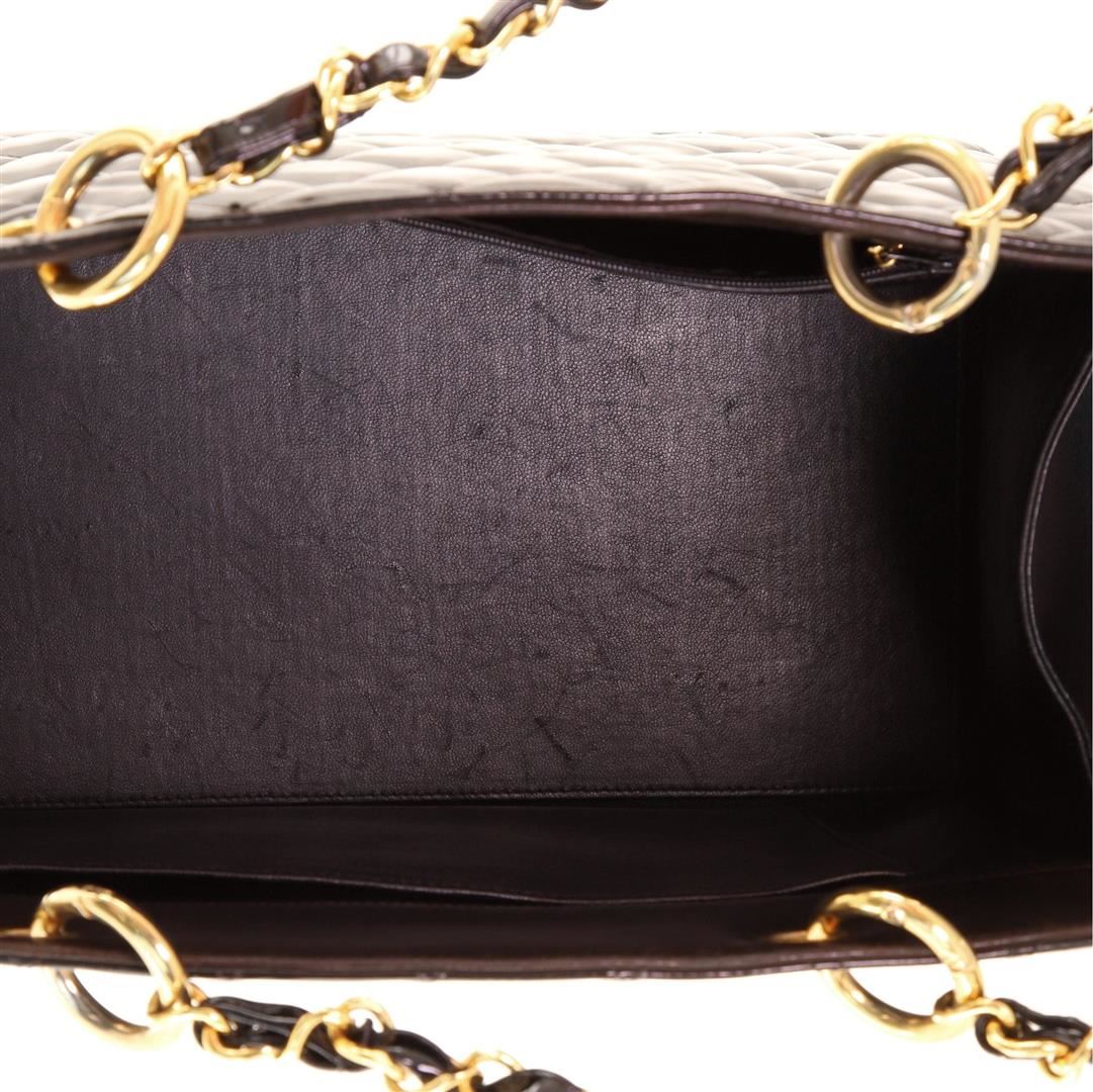Chanel Vintage Grand Shopping Tote Bag is crafted from black quilted patent leather, and accentuated with gold-tone hardware. It features double chain-link straps and a large stitched 'CC' logo front. This bag is also lined with smooth black leather and h