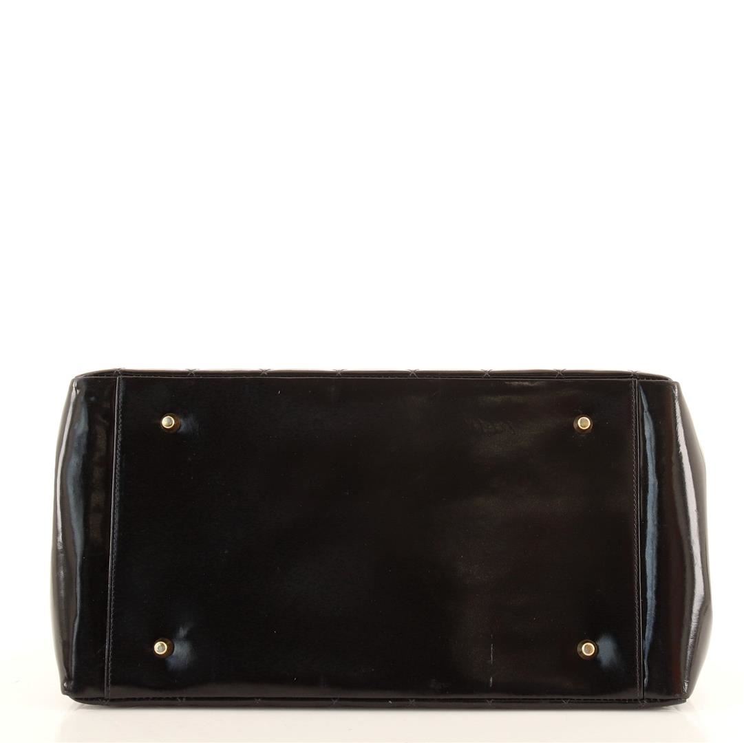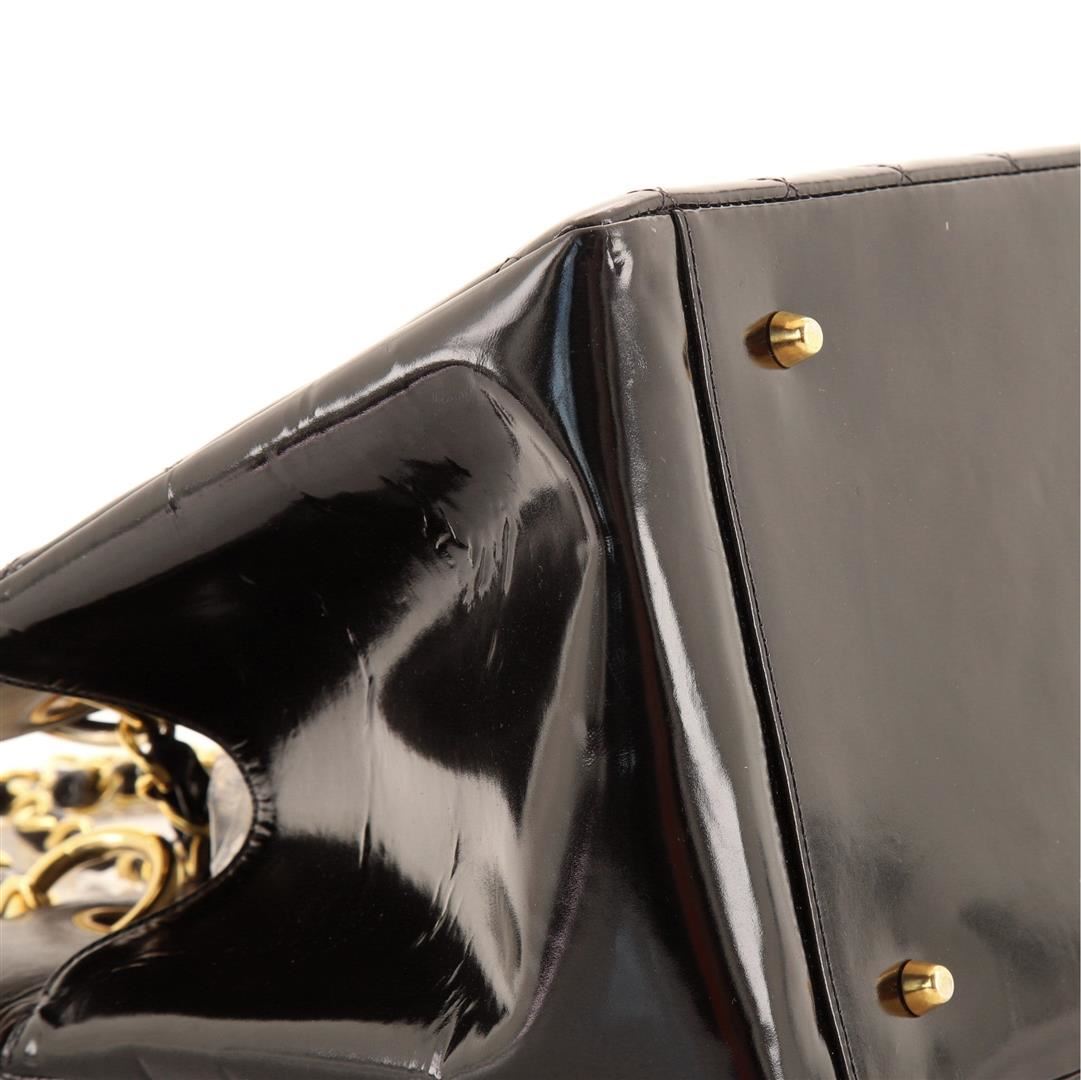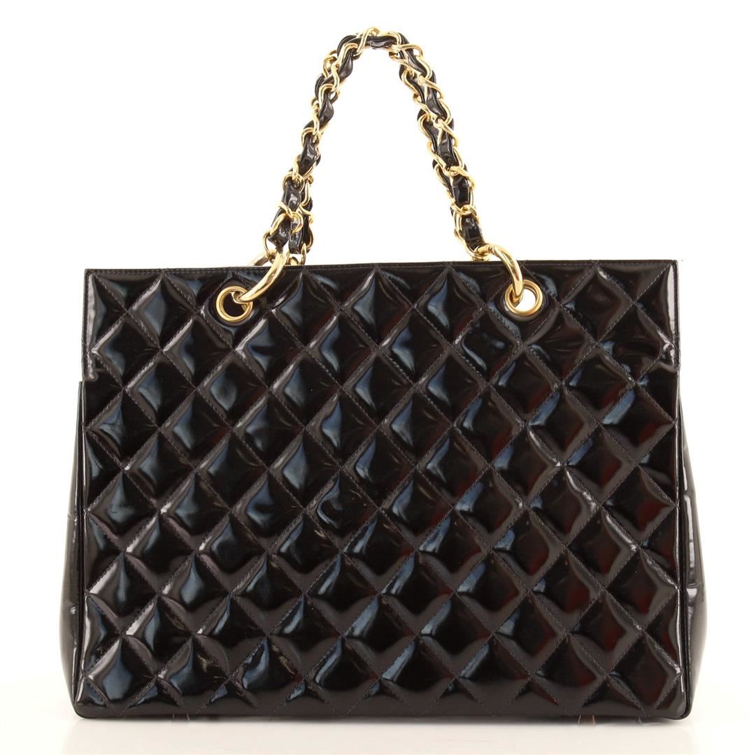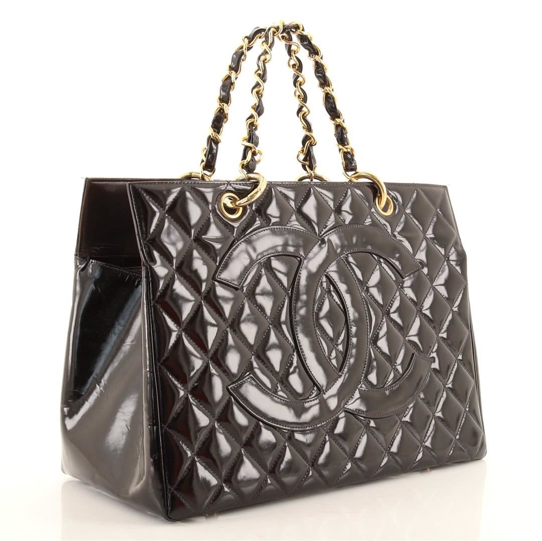 Chanel Vintage Grand Shopping Tote Bag is crafted from black quilted patent leather, and accentuated with gold-tone hardware. It features double chain-link straps and a large stitched 'CC' logo front. This bag is also lined with smooth black leather and h