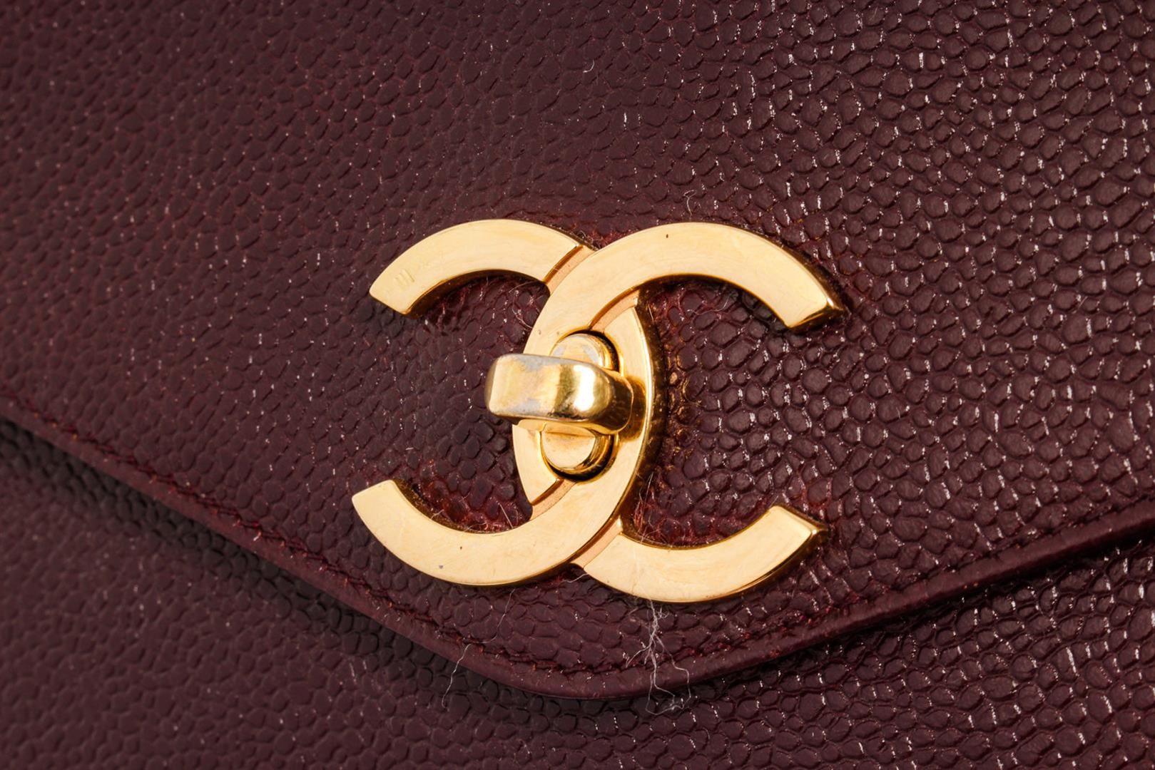 Chanel Vintage Burgundy Caviar Leather CC Turn Lock Shoulder Bag. All available information is listed in the description and shown in the photos. Burgundy grained Caviar leather Chanel medium shoulder bag with gold-tone hardware, an envelope-style front pocket with gold-tone interlocking CC turn-lock closure, dual shoulder straps with woven chain-link and leather detail, zipper closure at top that will open to burgundy leather-lined interior with zipped pockets inside. Length: 13" (33 cm) Height: 10.5" (26 cm) Depth: 4.5" (11 cm) Shoulder Strap Drop: 15" (38 cm)