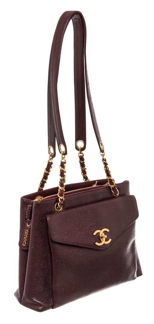Chanel Vintage Burgundy Caviar Leather CC Turn Lock Shoulder Bag. All available information is listed in the description and shown in the photos. Burgundy grained Caviar leather Chanel medium shoulder bag with gold-tone hardware, an envelope-style front pocket with gold-tone interlocking CC turn-lock closure, dual shoulder straps with woven chain-link and leather detail, zipper closure at top that will open to burgundy leather-lined interior with zipped pockets inside. Length: 13" (33 cm) Height: 10.5" (26 cm) Depth: 4.5" (11 cm) Shoulder Strap Drop: 15" (38 cm)