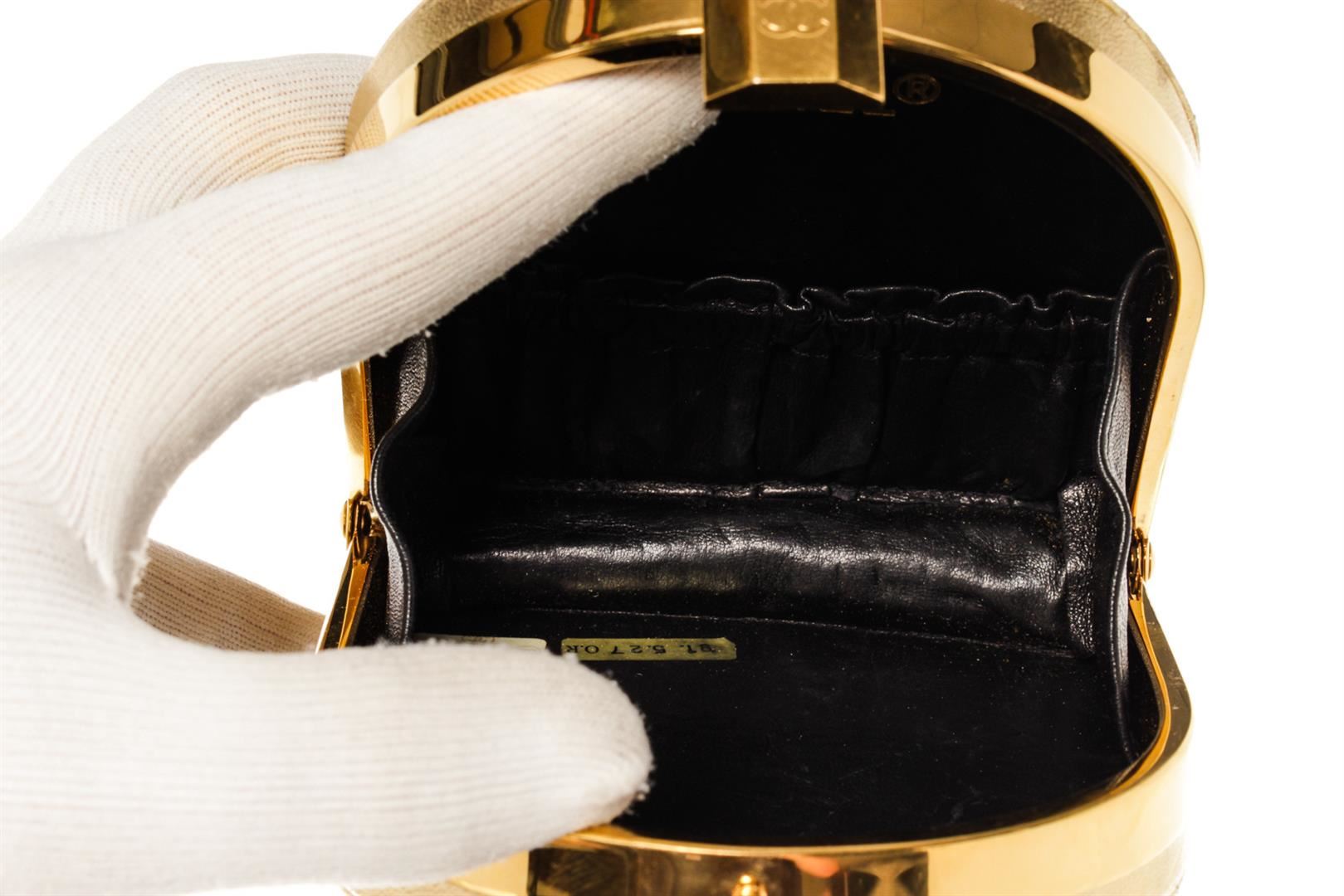 Chanel Vintage Gold Metallic Quilted Leather Frame Mini Clutch Bag. All available information is listed in the description and shown in the photos. Gold metallic quilted leather Chanel Vintage Frame Mini clutch bag with gold-tone hardware, woven chain-link and leather strap, black leather lining and kiss-lock closure at top. Height 5", Width 4.5", Depth 1", Strap Drop 21"