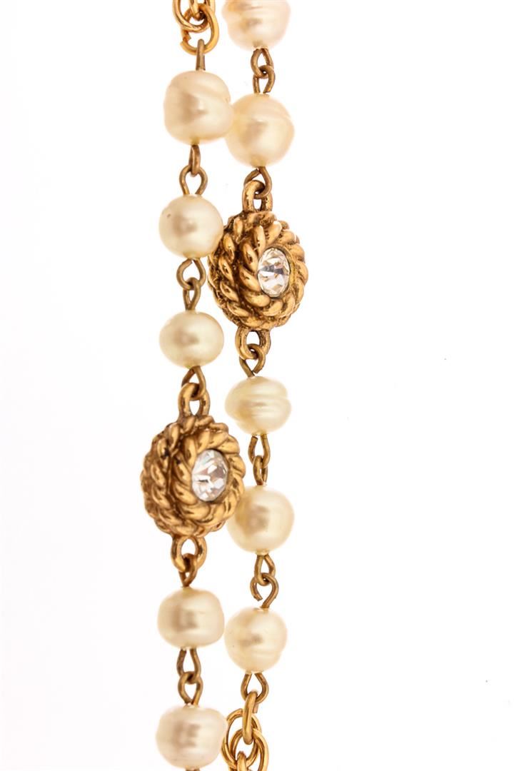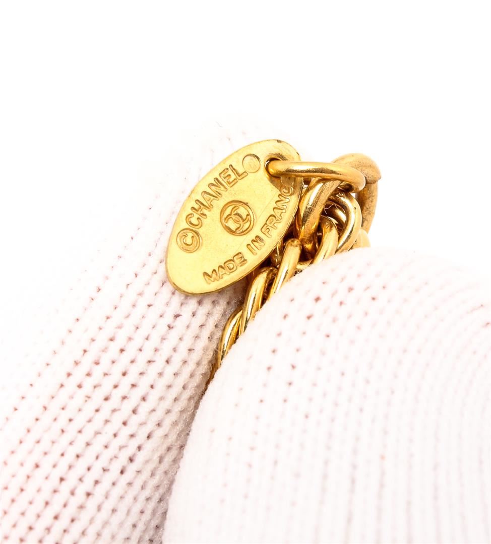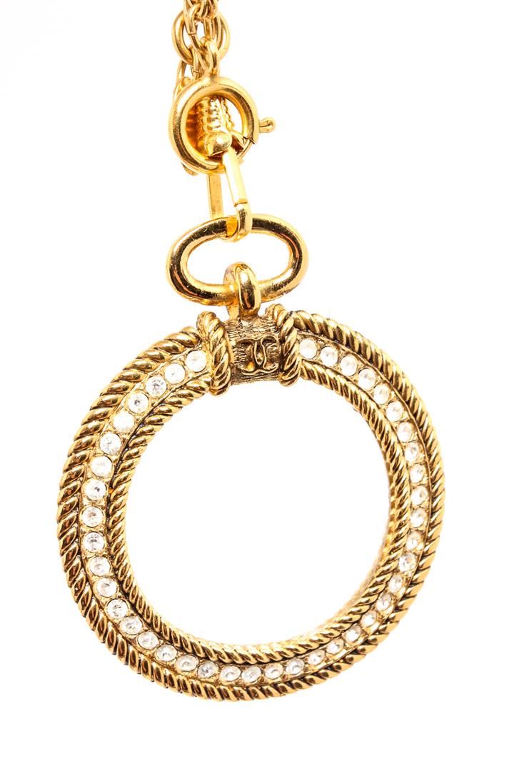 Gold-tone chain link with faux pearl and rhinestone details and magnifying CC glass pendant and a large spring clasp closure.