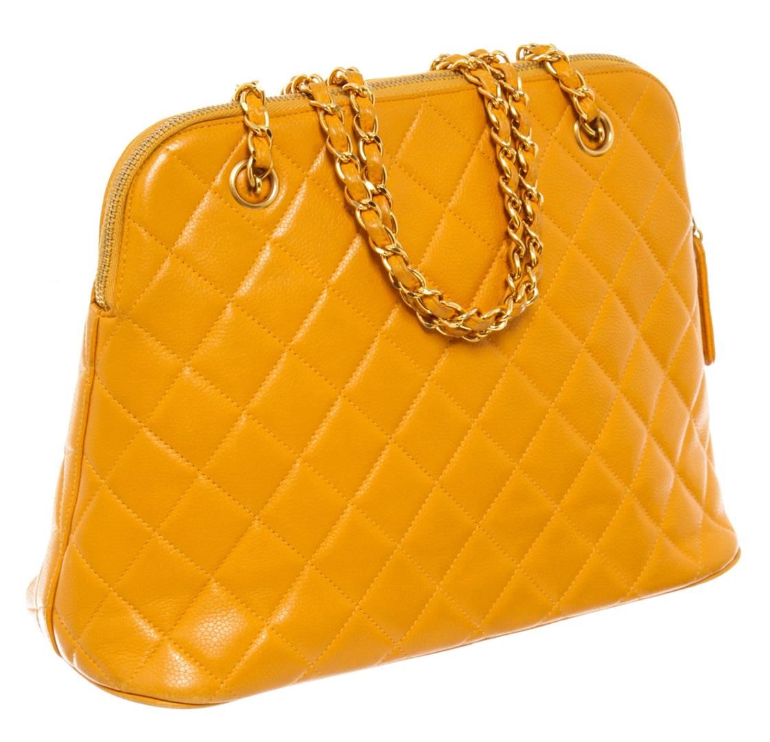 One Chanel Vintage Yellow Caviarskin Leather Matelasse Chain Shoulder Bag. Item is sold AS-IS. All available information is listed in the description and shown in the photo. Chanel Matelasse Shoulder Bag in yellow quilted Caviar leather and has gold-tone hardware. It has a unique rounded top shape with a wrap-around zipper closure. The zipper has a stylish zipper tag with "CHANEL" in large gold letters. The bottom has a large CC logo stitched and embossed on. The inside is lined with yellow lambskin leather and has one zipper and one slip pocket. 11.4" x 4.3" x 8.7"