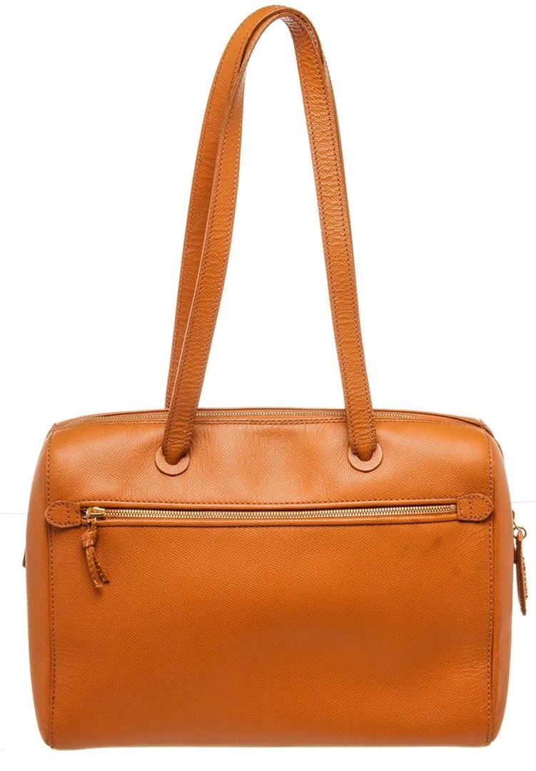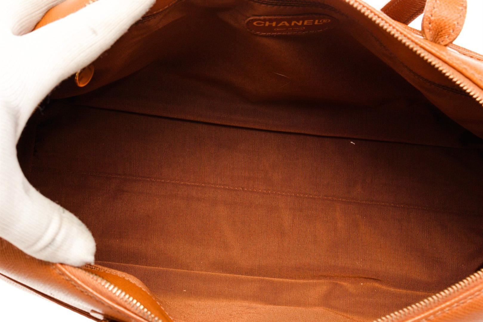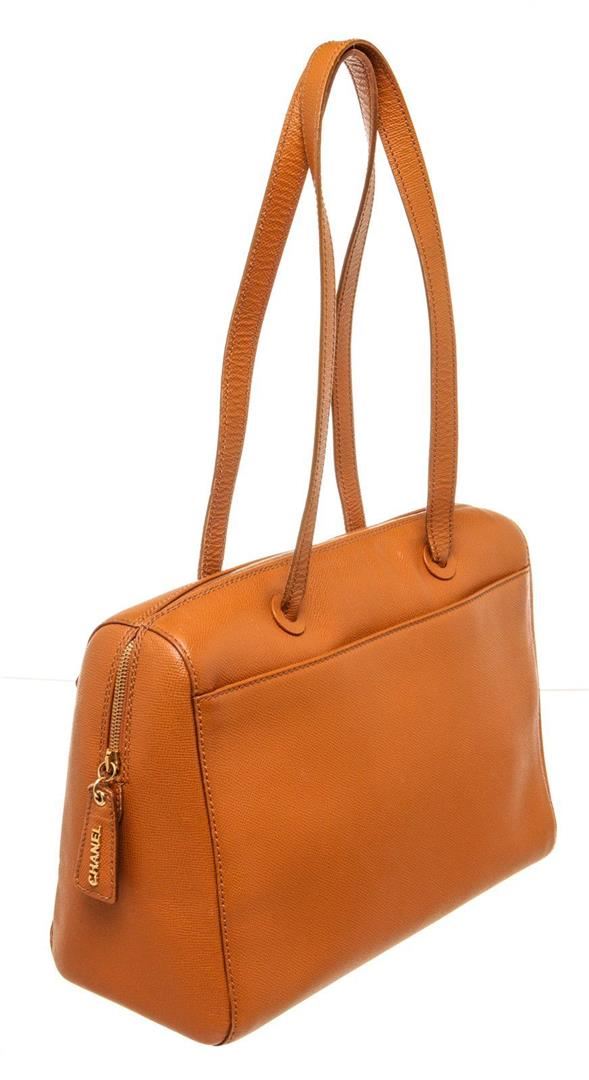 Chanel Vintage Zip Around Orange Shoulder Bag with gold hardware, classic Interwoven top handle, detachable classic interwoven chain strap, patent leather diamond stitching, flat and zippered pockets at interior, and zip-around closure. Vanity-style tote ideal for holding makeup or used as a purse.