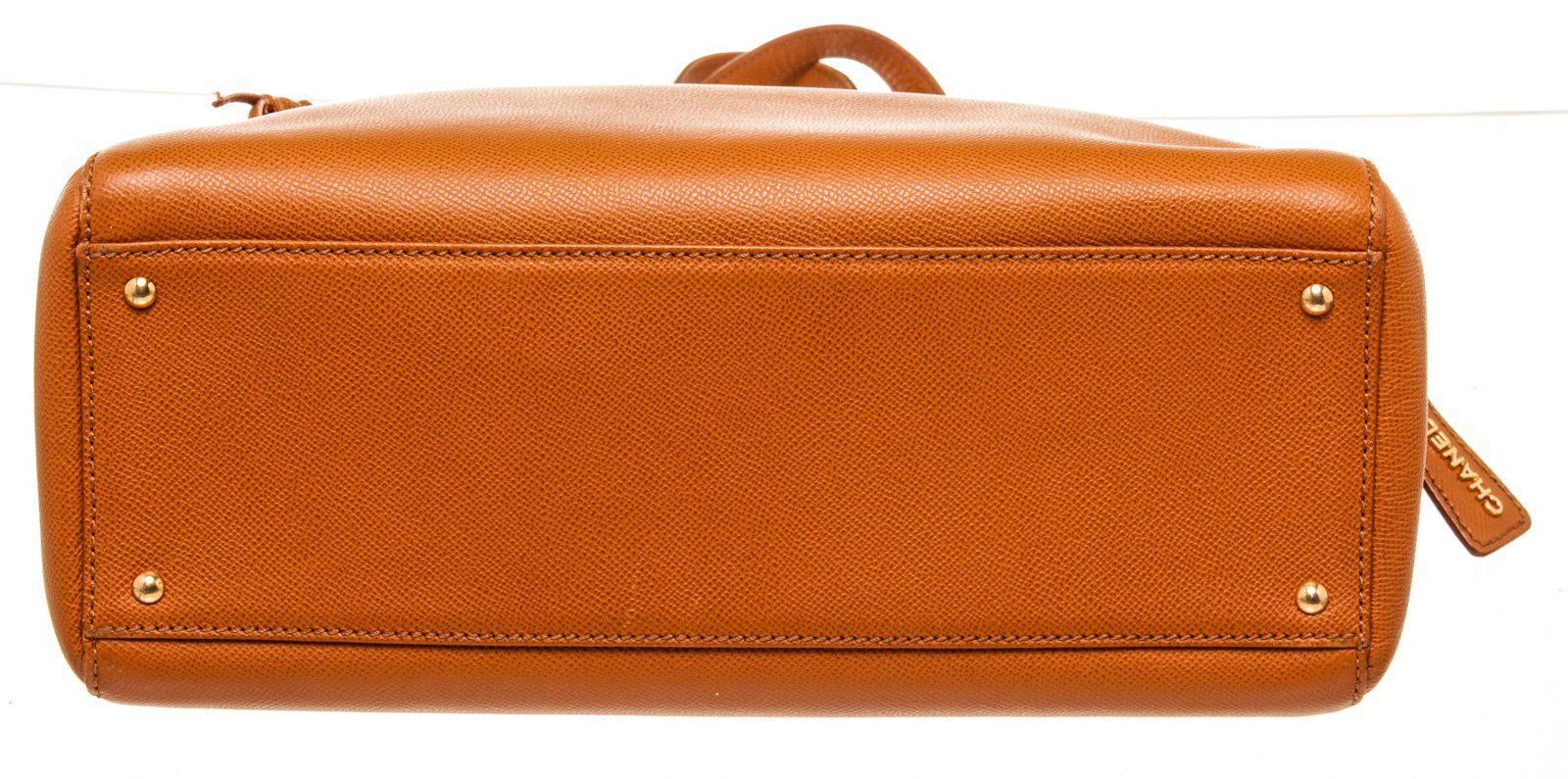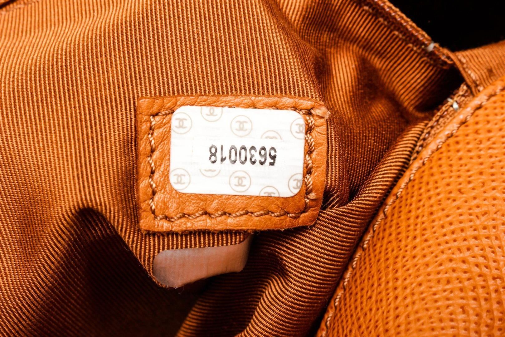 Chanel Vintage Zip Around Orange Shoulder Bag with gold hardware, classic Interwoven top handle, detachable classic interwoven chain strap, patent leather diamond stitching, flat and zippered pockets at interior, and zip-around closure. Vanity-style tote ideal for holding makeup or used as a purse.