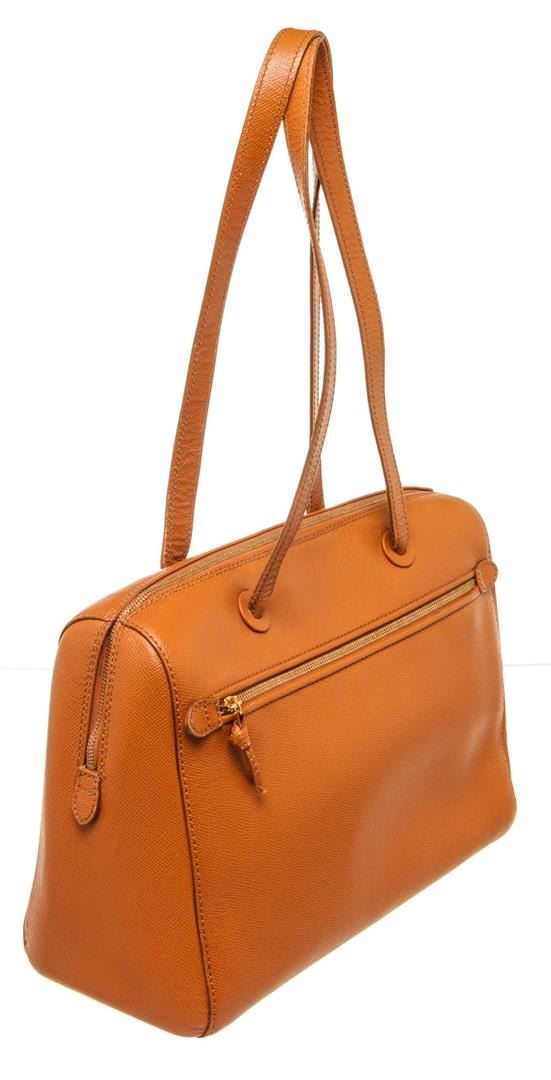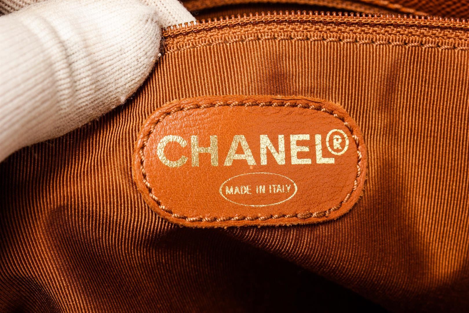 Chanel Vintage Zip Around Orange Shoulder Bag with gold hardware, classic Interwoven top handle, detachable classic interwoven chain strap, patent leather diamond stitching, flat and zippered pockets at interior, and zip-around closure. Vanity-style tote