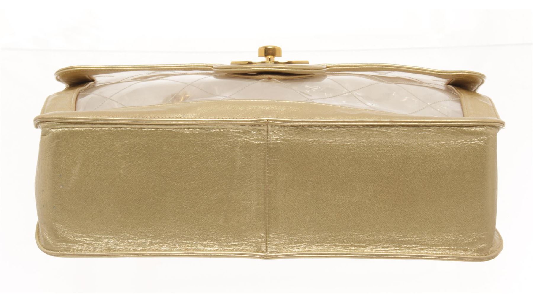 Chanel Vinyl Gold Lambskin Flap Maxi Shoulder Bag. All available information is listed in the description and shown in the photos. Chanel Vinyl Gold Lambskin Flap Maxi Shoulder Bag with leather and chain-link shoulder strap, interlocking cc turn-lock fastening, main compartment, slip pocket to the rear, gold-tone hardware. Depth 3.9 in, Height 9.1 in, Strap 13 in, Width 13.2 in / Depth 10 cm, Height 23 cm, Strap 33 cm, Width 33.5 cm