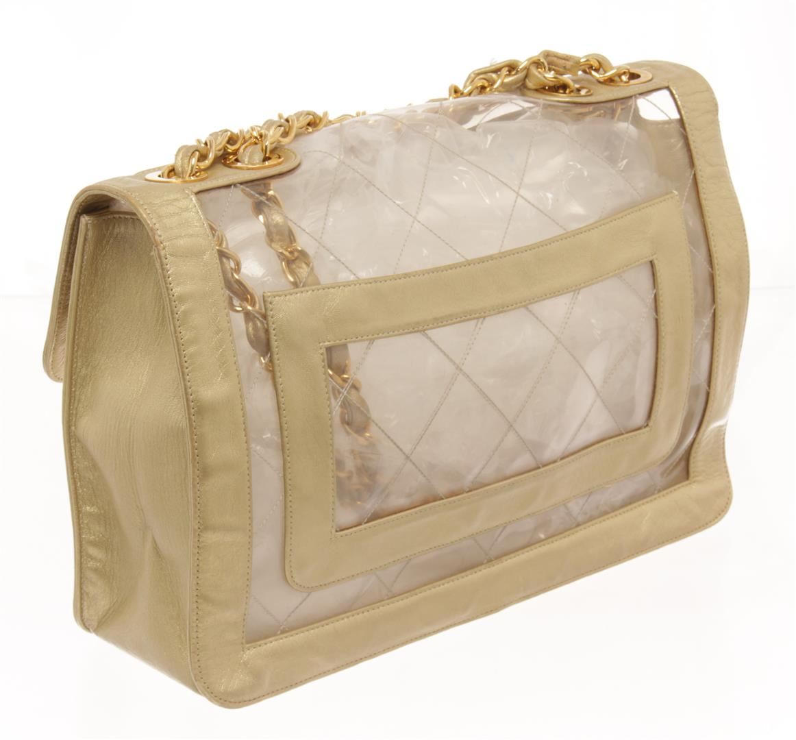 Chanel Vinyl Gold Lambskin Flap Maxi Shoulder Bag. All available information is listed in the description and shown in the photos. Chanel Vinyl Gold Lambskin Flap Maxi Shoulder Bag with leather and chain-link shoulder strap, interlocking cc turn-lock fastening, main compartment, slip pocket to the rear, gold-tone hardware. Depth 3.9 in, Height 9.1 in, Strap 13 in, Width 13.2 in / Depth 10 cm, Height 23 cm, Strap 33 cm, Width 33.5 cm