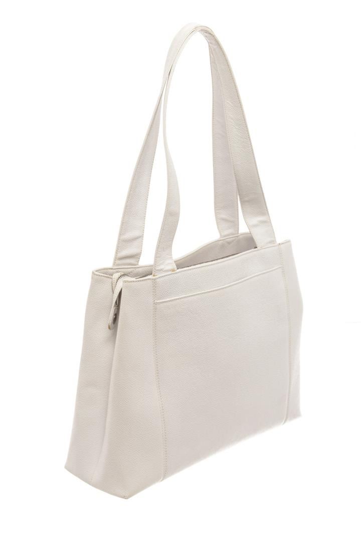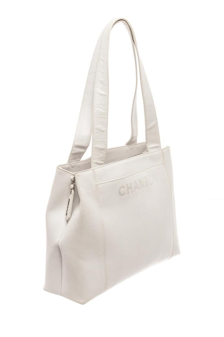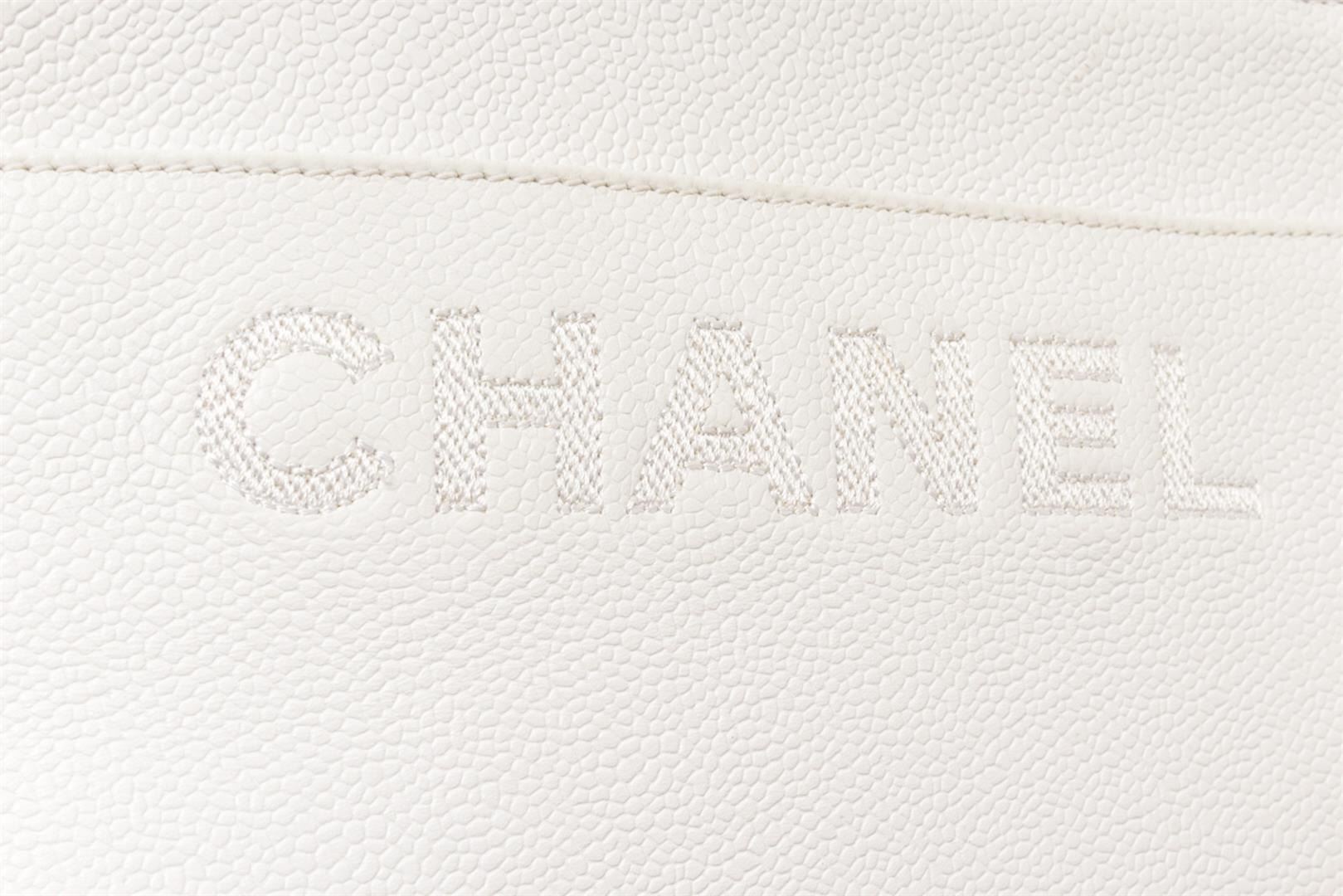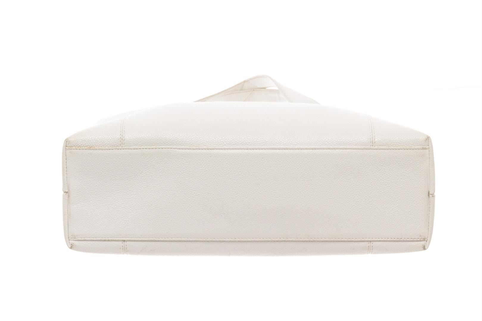 Chanel White Caviar Leather Tote Bag. All available information is listed in the description and shown in the photos. Chanel White Caviar Leather Tote Bag with double flat leather handles, two exterior slip pockets, white fabric lined interior with two zip pockets, and gold tone hardware, embroidered on the front side, three compartments: two open and one middle compartment with top zip closure.