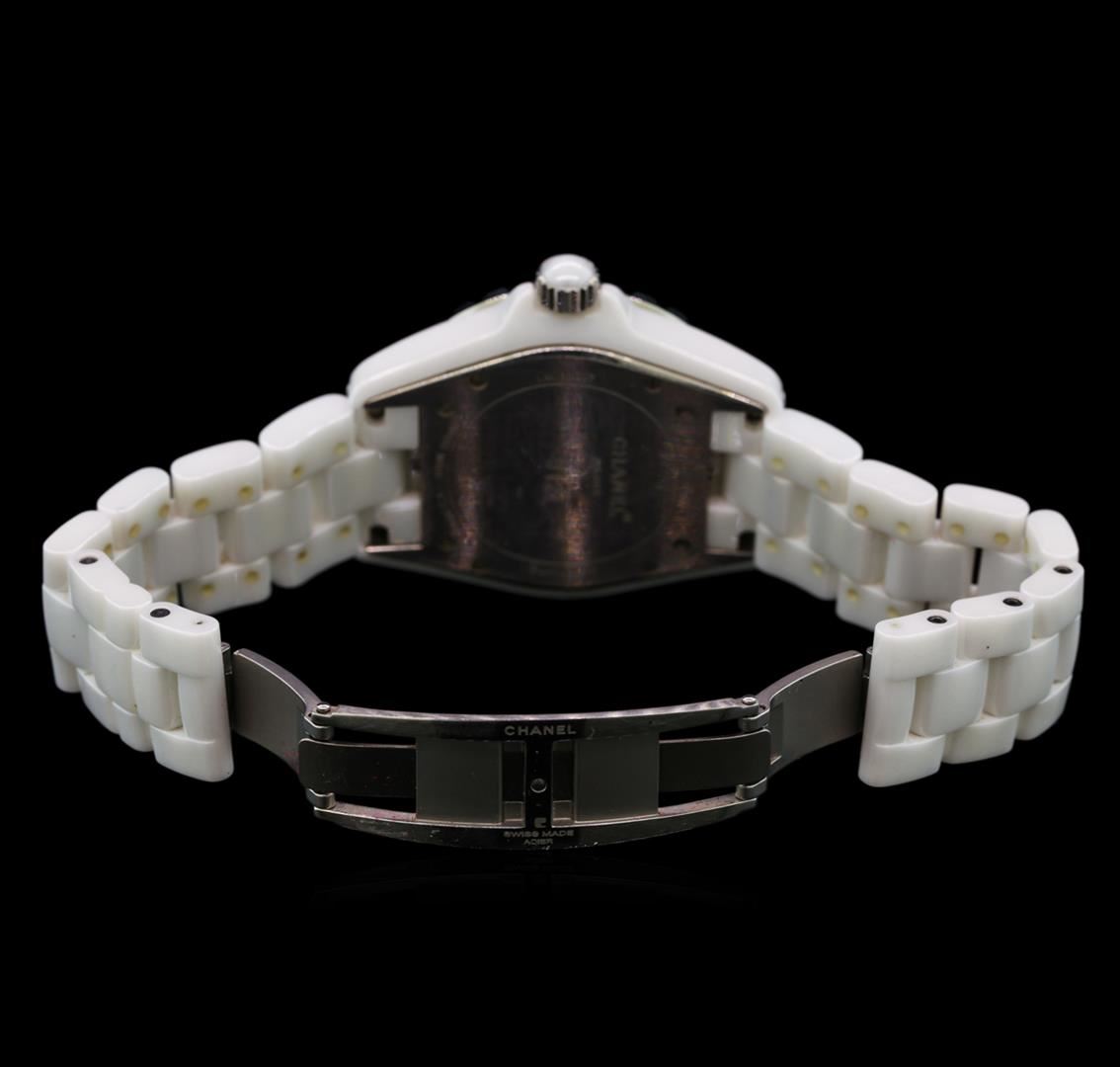 Pre-owned Chanel J12 White Ceramic H1629 Diamond Dial with almost no signs of wear. This 38mm piece features a white dial with diamonds at the hour marks. This has a white ceramic bezel, case, and bracelet. This also features an automatic movement. This watch includes the original box. All pictures are of the actual item being sold.