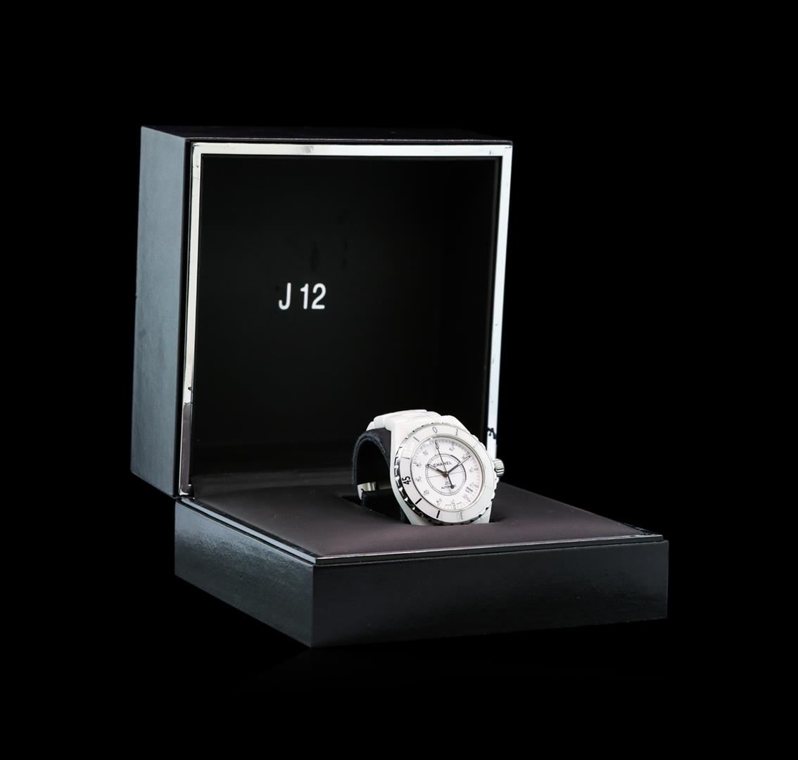 Pre-owned Chanel J12 White Ceramic H1629 Diamond Dial with almost no signs of wear. This 38mm piece features a white dial with diamonds at the hour marks. This has a white ceramic bezel, case, and bracelet. This also features an automatic movement. This watch includes the original box. All pictures are of the actual item being sold.