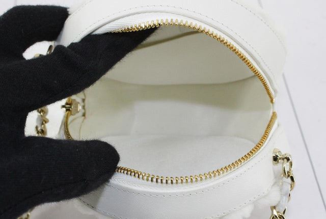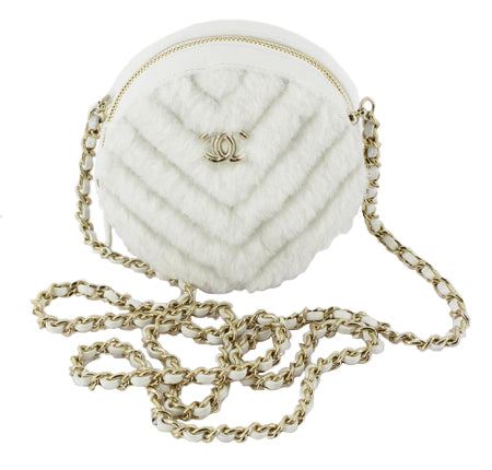 This stylish Chanel crossbody bag is crafted of luxurious Chevron quilted fur in white. The bag features a polished gold-tone chain-link with leather threaded shoulder strap and a gold-tone interlocking CC logo on the front. This shoulder bag opens with a