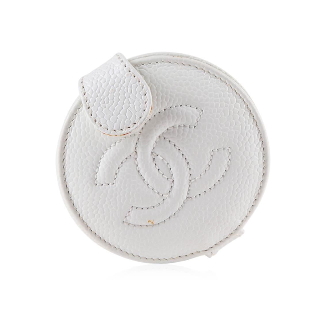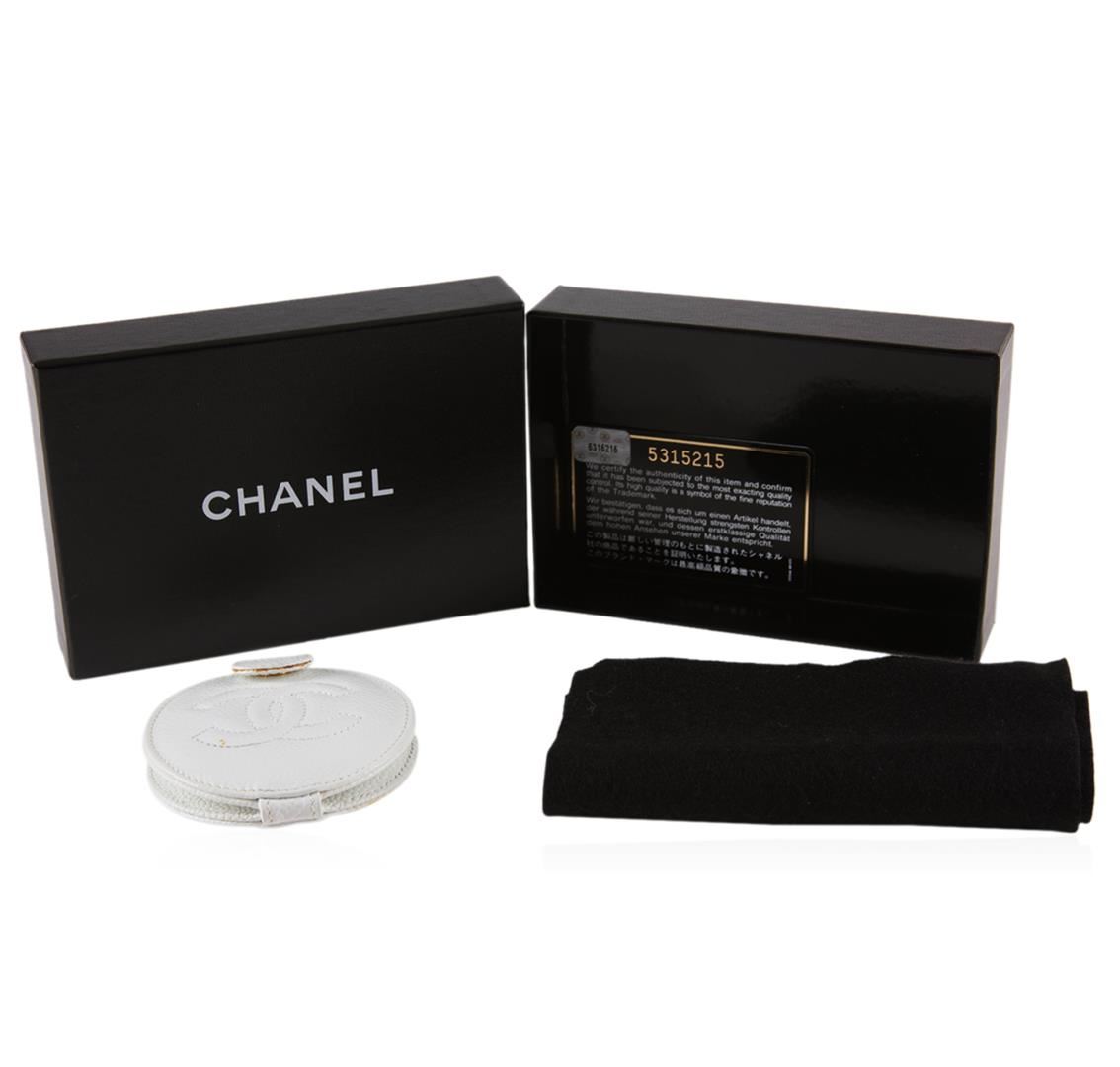 One Chanel white leather makeup mirror, measuring 8cm in diameter. The mirror is in good condition with a small blemish on the front and blemishes along the binding of the clasp. Inside are two mirrors, one normal and one with increased magnification for fine details. Comes with a Chanel box and authenticity card.