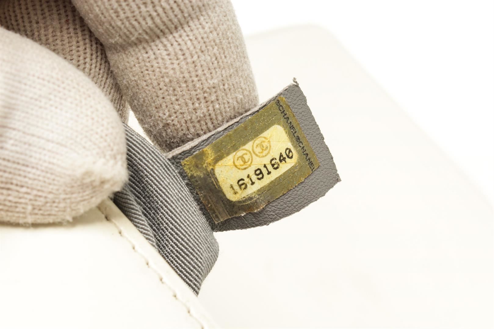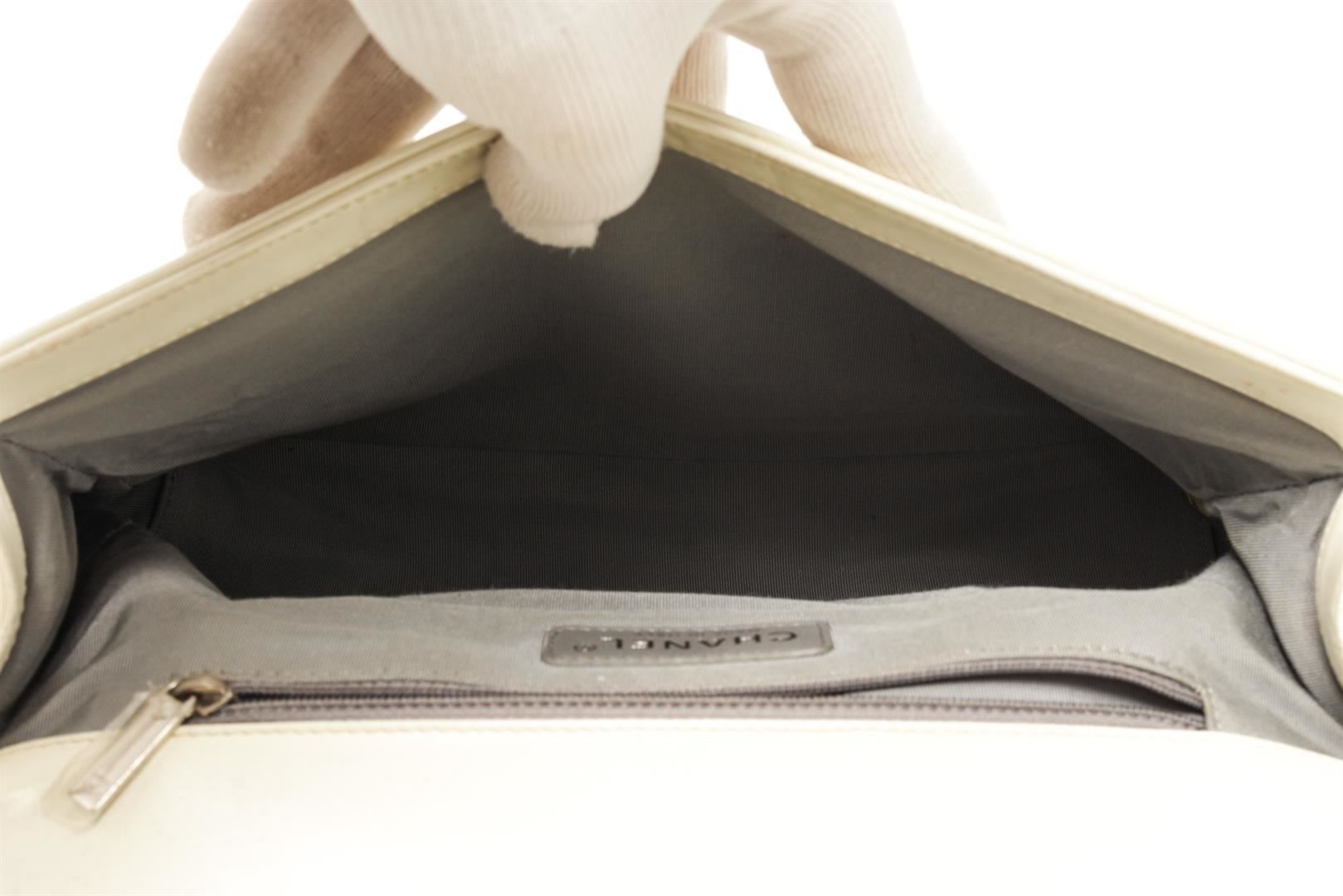 Chanel White Patent Leather Large Boy Shoulder Bag. All available information is listed in the description and shown in the photos. chanel white patent leather large boy bag with patent leather, white-tone hardware, white leather trim, interior zip pockets, white patent lining, dual top handles, chain-link shoulder straps. PLEASE NOTE: Creasing found at base of bay. Height: 12 in (30.48 cm), Width: 3.5 in (8.89 cm), Depth: 7.5 in (19.05 cm)