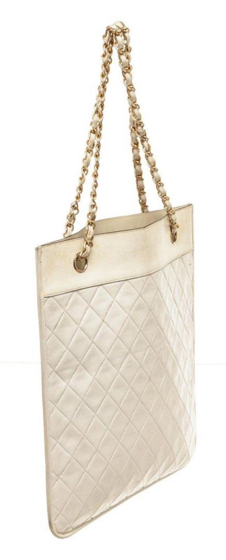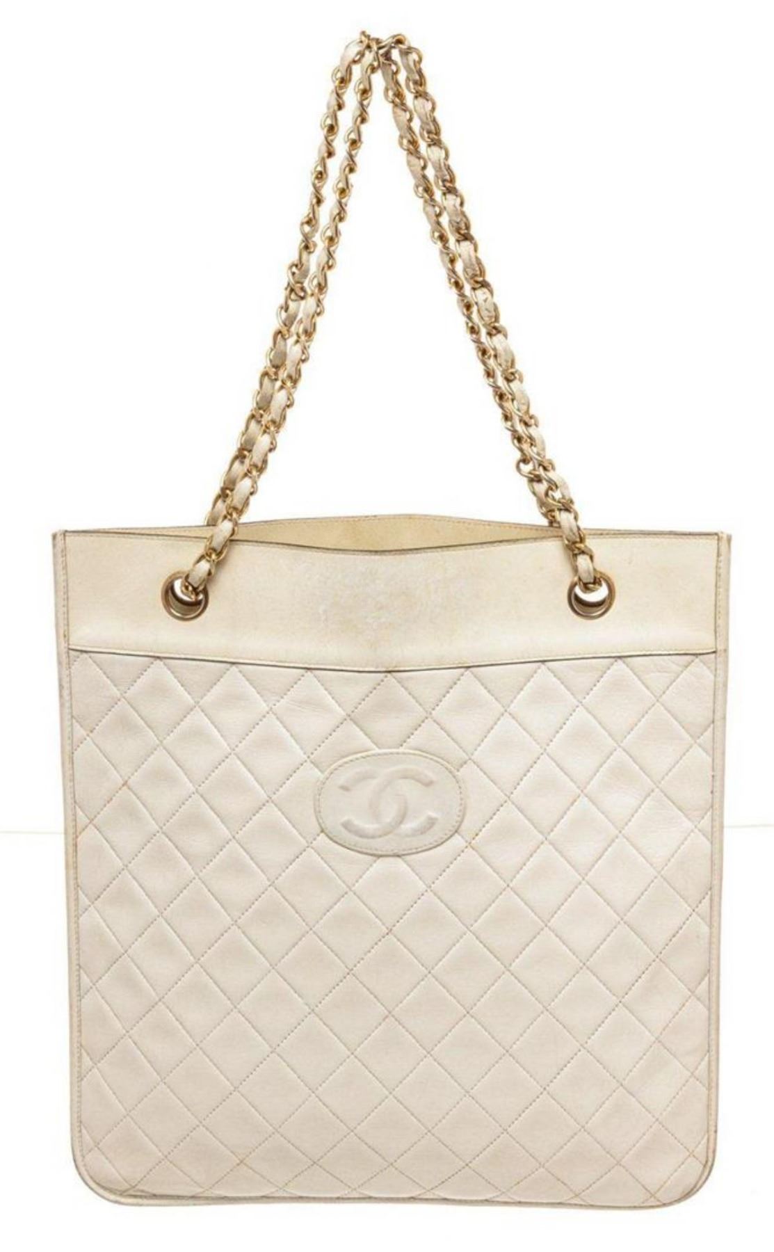 Chanel White Vintage CC Flat Chain Shoulder Bag with material leather, gold-tone hardware, interior slip pocket, and chain shoulder strap.