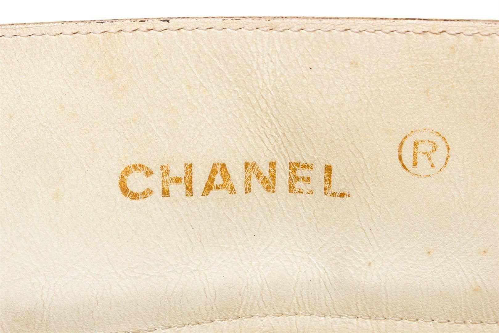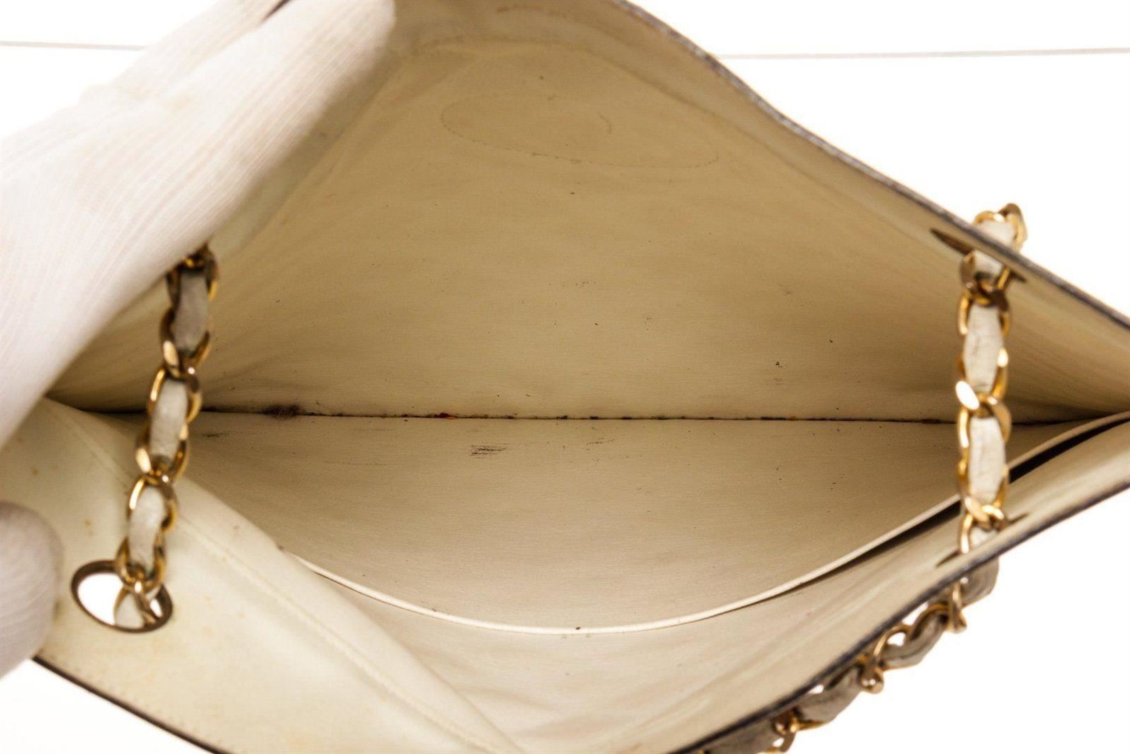 Chanel White Vintage CC Flat Chain Shoulder Bag. All available information is listed in the description and shown in the photos. Chanel White Vintage CC Flat Chain Shoulder Bag with material leather, gold-tone hardware, interior slip pocket, and chain shoulder strap. Please note: vintage condition, leather is dry.