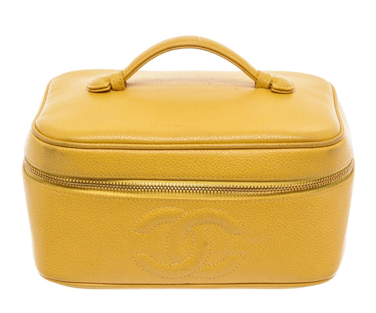 Chanel Yellow Caviar Leather Small CC Vanity Cosmetic Bag. All available information is listed in the description and shown in the photos. Chanel Yellow Caviar Leather Small CC Vanity Cosmetic Bag with featuring a top handle, an all around zip fastening, a front embossed logo stamp, gold-tone hardware, an internal mirror, an internal logo patch and a white lining. Height: 2.8" Width: 5.9" Depth: 3.1", Handle Drop: 0.6" / 7 x 15 x 8 Cm