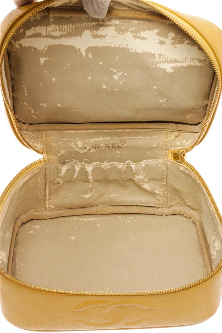 Chanel Yellow Caviar Leather Small CC Vanity Cosmetic Bag. All available information is listed in the description and shown in the photos. Chanel Yellow Caviar Leather Small CC Vanity Cosmetic Bag with featuring a top handle, an all around zip fastening, a front embossed logo stamp, gold-tone hardware, an internal mirror, an internal logo patch and a white lining. Height: 2.8" Width: 5.9" Depth: 3.1", Handle Drop: 0.6" / 7 x 15 x 8 Cm