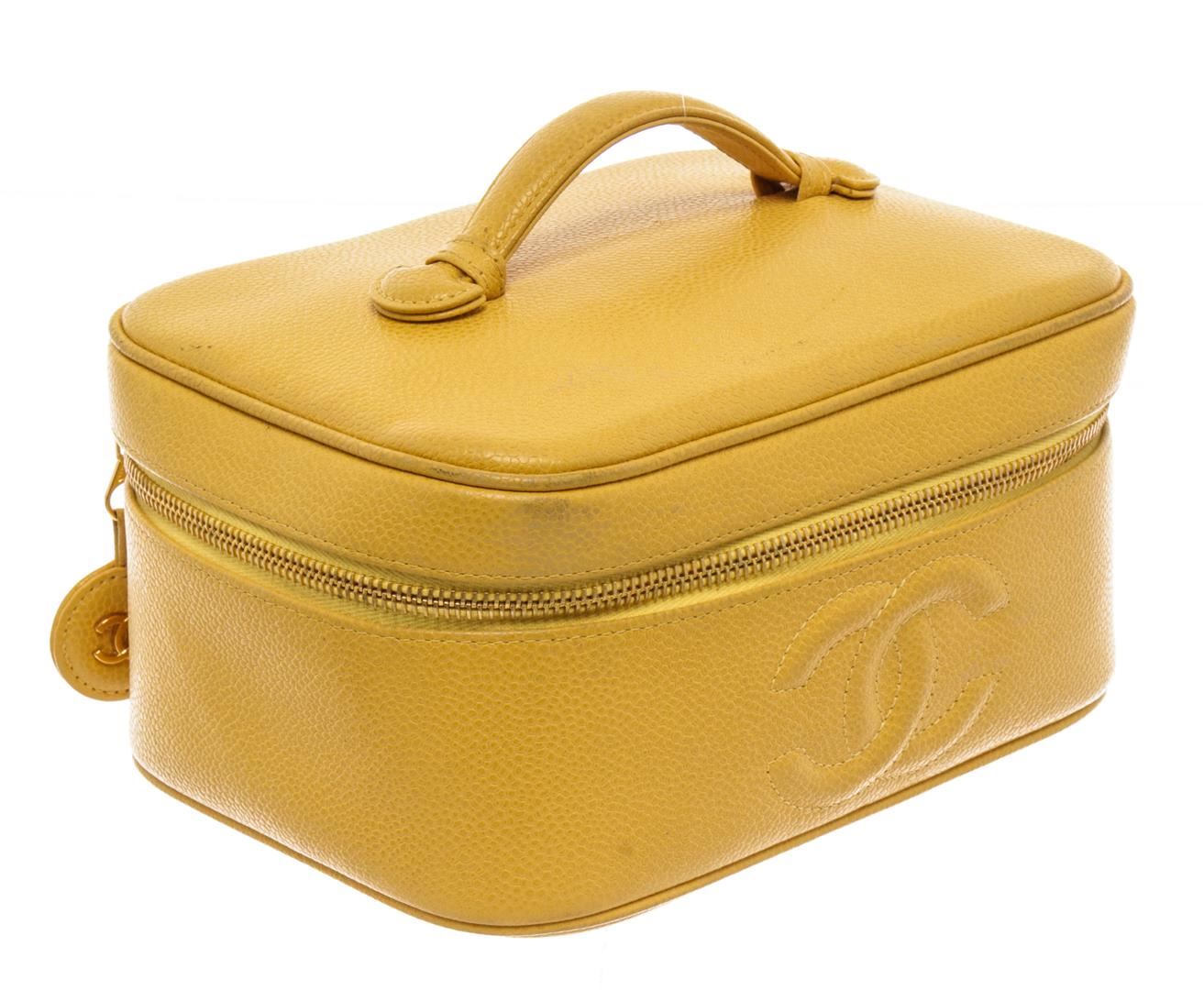 Chanel Yellow Caviar Leather Small CC Vanity Cosmetic Bag. All available information is listed in the description and shown in the photos. Chanel Yellow Caviar Leather Small CC Vanity Cosmetic Bag with featuring a top handle, an all around zip fastening, a front embossed logo stamp, gold-tone hardware, an internal mirror, an internal logo patch and a white lining. Height: 2.8" Width: 5.9" Depth: 3.1", Handle Drop: 0.6" / 7 x 15 x 8 Cm