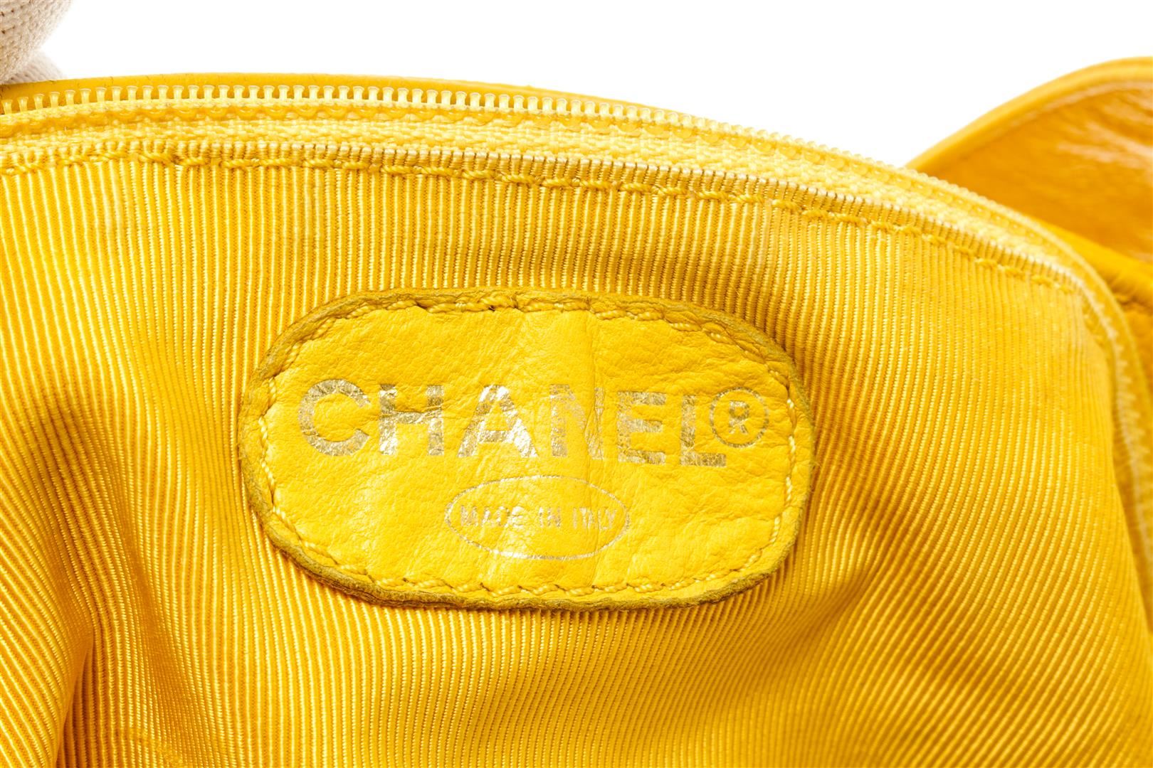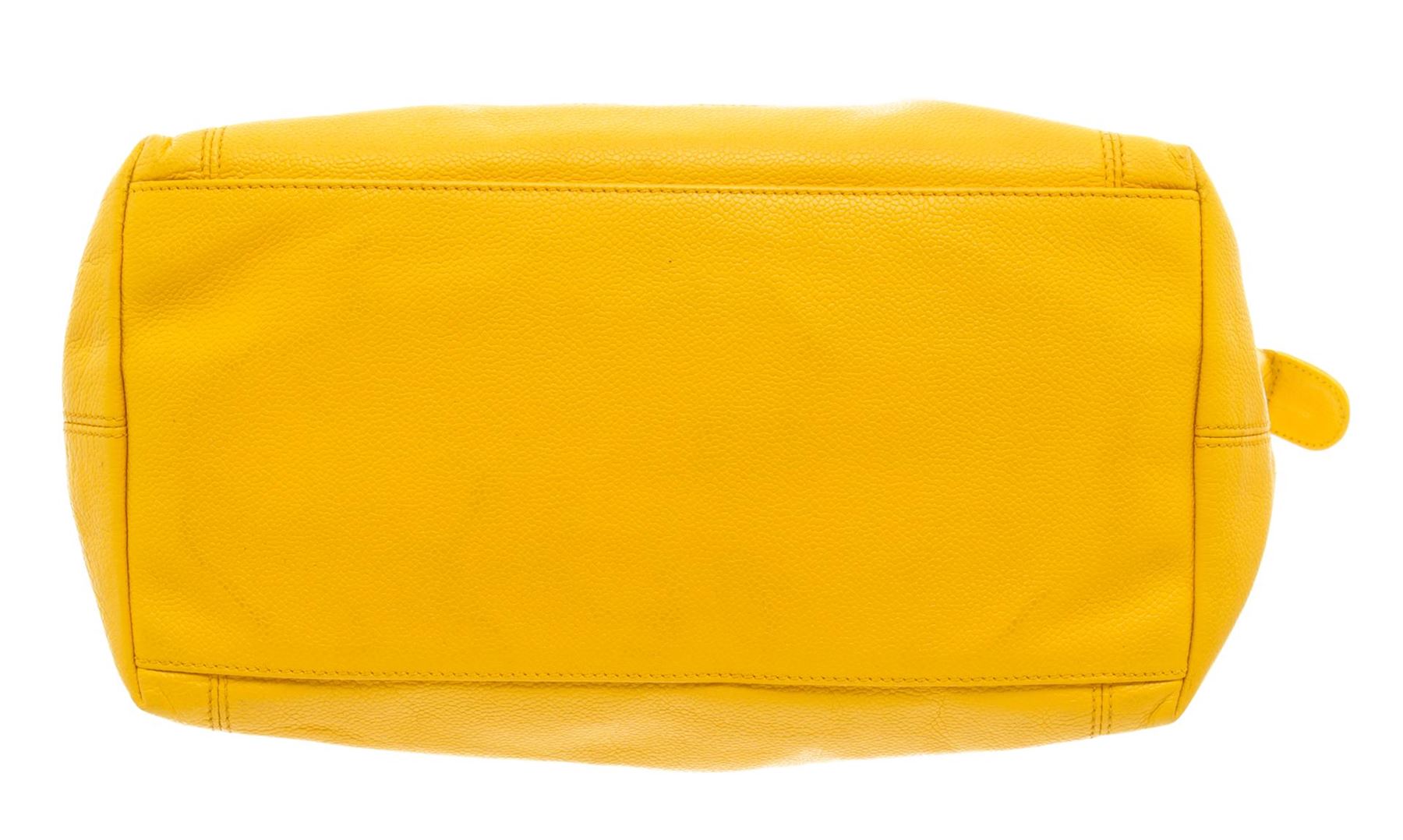 One Chanel Yellow Leather Vintage CC Shoulder Bag. Item is sold AS-IS. All available information is listed in the description and shown in the photo. Chanel yellow leather vintage CC shoulder bag with yellow leather exterior with a stitched-in CC logo on the front, two top handles, yellow fabric lining, gold-tone hardware, zipper closure, Chanel logo on the exterior zipper tab, CC logo on the interior zipper tag, and one main compartment with one zip pocket. There is some wear on the zipper, stains on the canvas lining as shown in pictures.