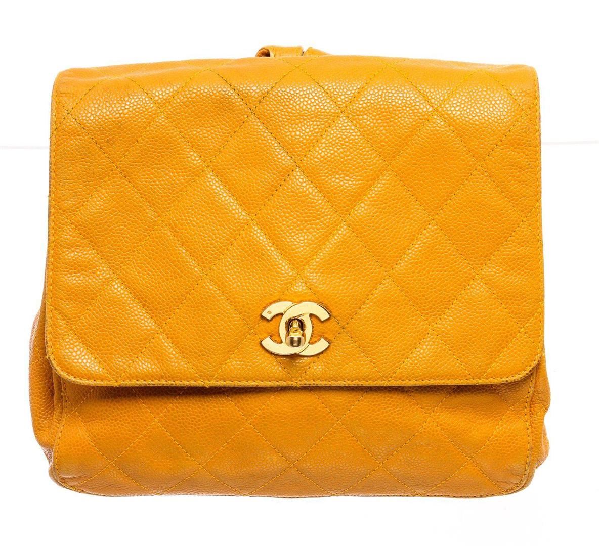 Yellow quilted caviar leather Chanel vintage backpack with gold-tone hardware, dual leather shoulder strap, single slip exterior pocket, cream fabric lining and turn lock CC flap at front. Measurements: Length: 9.5 in / 24 cm Width: 3.25 in / 8 cm 9 in / 23 cmCONDITION: Pre-Owned Good overall condition. Please refer to photographs.