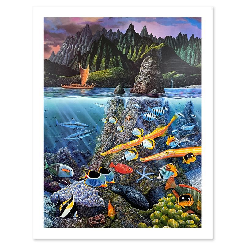 "Chant to Nature (Triptych)" is a limited edition mixed media on paper by Robert Lyn Nelson, numbered and hand signed by the artist. Includes Letter of Authenticity. Measures approx. 54" x 27.5" (image). There may be minor imperfections on the paper but the piece is in overall good condition.
