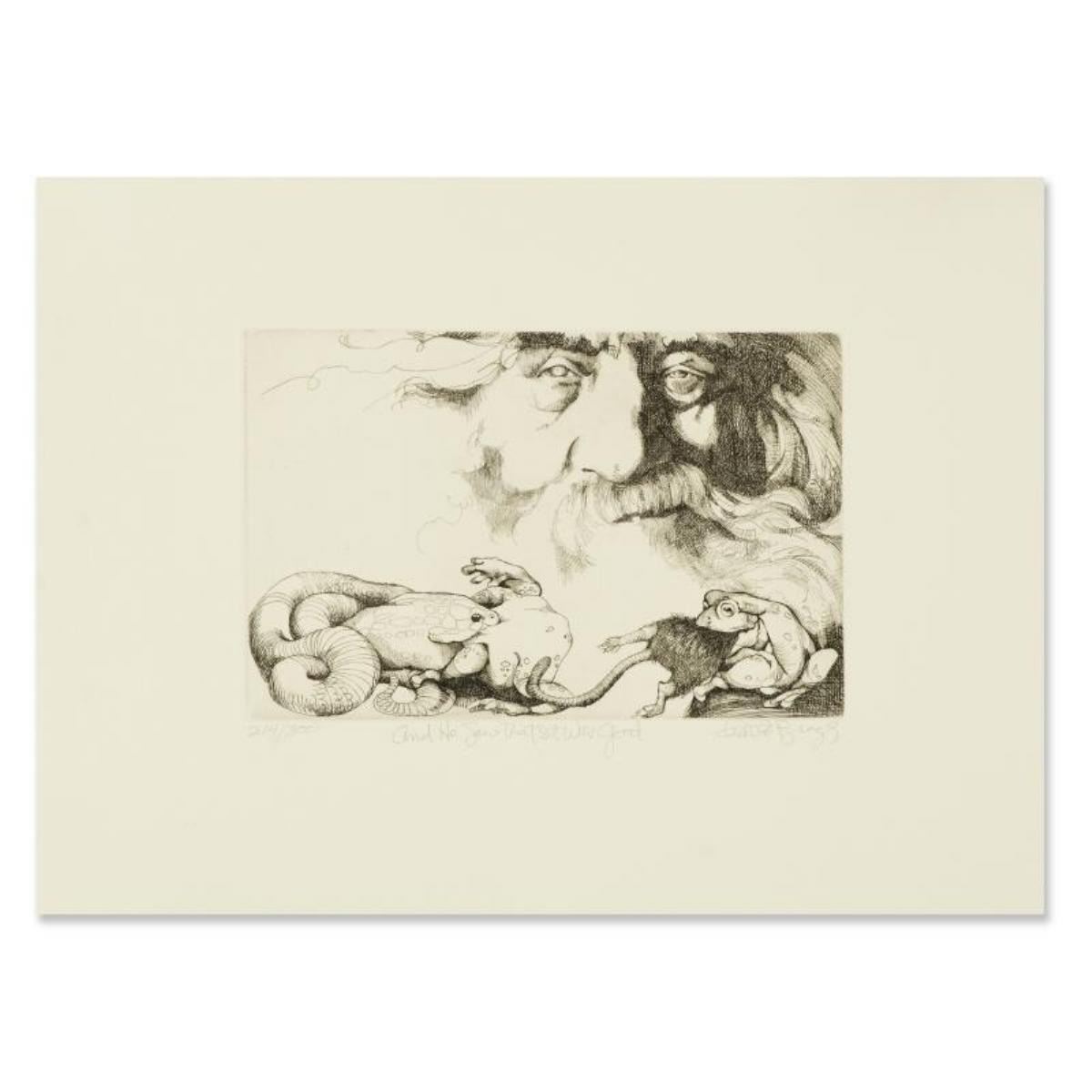 "And He Saw That it Was Good" is a limited edition etching on Paper by Charles Bragg (1931-2017), numbered and hand signed by the artist. Includes Letter of Authenticity. Measures approx. 15" x 11" (border), 9" x 6" (image).