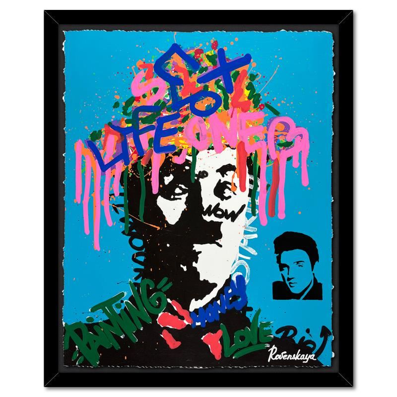 "Charlie's Hat" is a one-of-a-kind mixed media on deckle edge paper by Nastya Rovenskaya; hand signed by the artist. This piece comes custom framed and includes letter of authenticity. Measures approximately 36" x 30.5" (framed), 30" x 24.5" (image). This item requires special handling and may have a longer than usual turnaround.