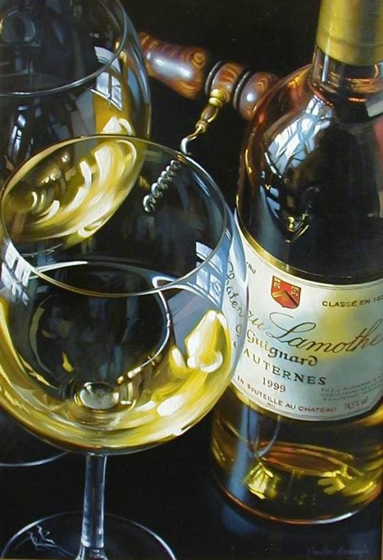 Chateau LaMothe (narrow) by Dimitri Annenkov exhibits a Chateau LaMothe bottle of wine next to a wine glass. Framed original oil on linen sized at 45 1/2" x 15 3/4".