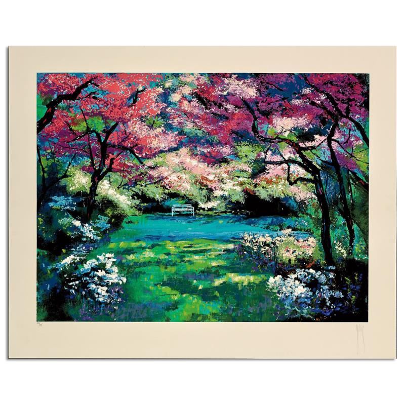 "Cherry Blossom Corner" is a limited edition serigraph on paper by Mark King (1931-2014). Hand signed and numbered, this piece comes with a letter of authenticity and measures approximately 27" x 36" (image).