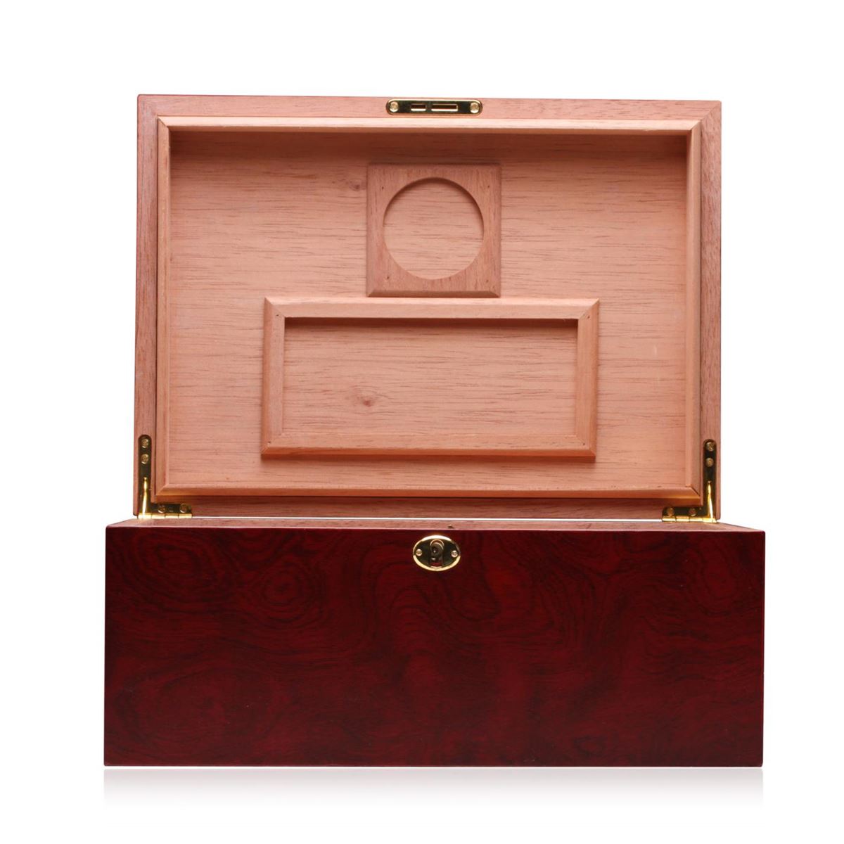 One deluxe cigar humidor featuring a glossy cherry wood exterior lined with premium Spanish cedar and solid brass hardware. Beautifully handcrafted to provide your cigars with the perfect environment for storage. This deluxe humidor will surely enhance your cigars smell and taste. Includes: Humidor, Hygrometer, Humidification System, Accessories, Instructions Manual. Measures 12 x 6 x 9.25 inches.