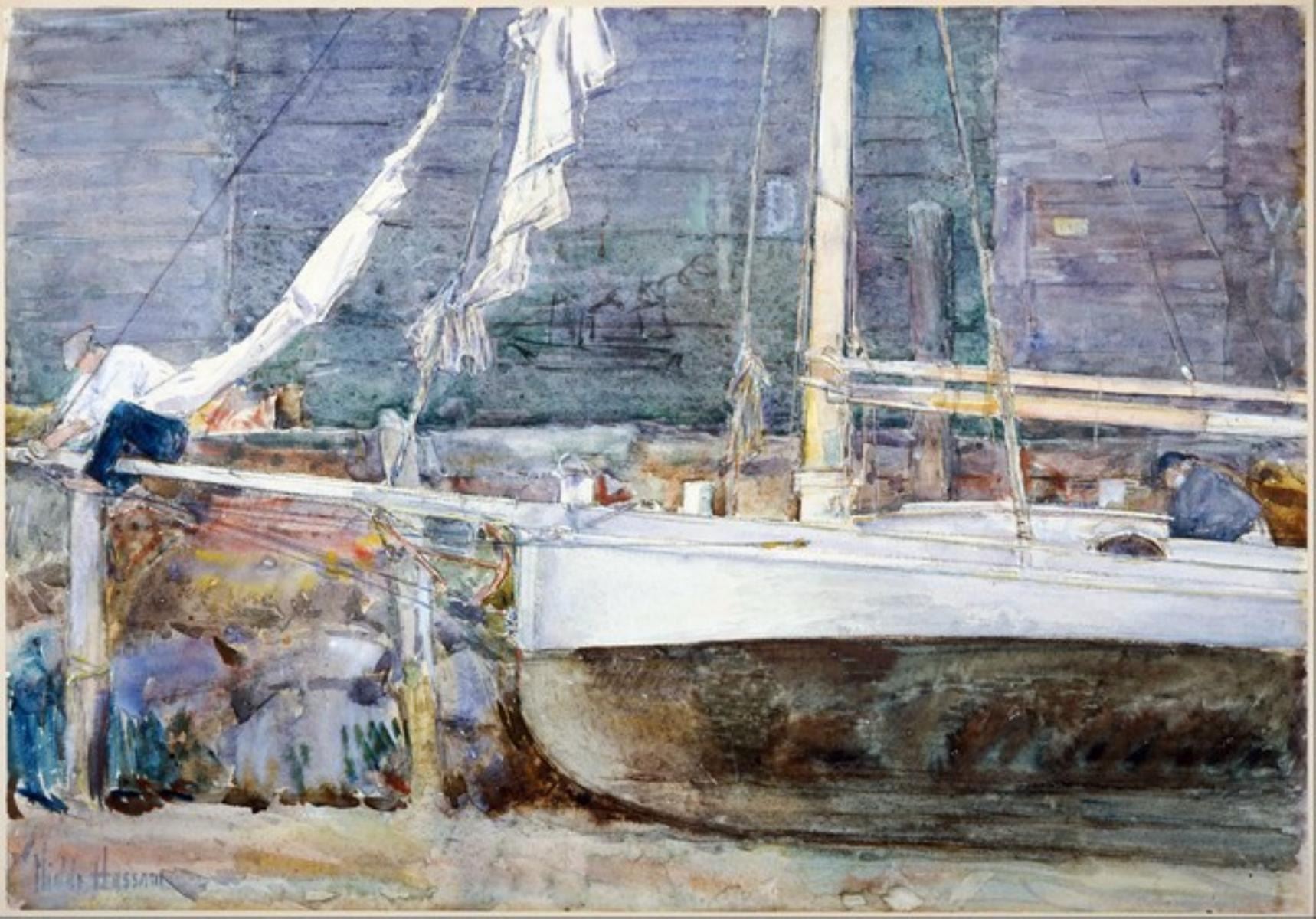 Artist: Childe Hassam - Title: Drydock, Gloucester - Medium: Fine Art Giclee on Canvas - Image Size: Approximately 22.25 inches x 32 inches - Framed: Unframed on Unstretched Canvas - Biography: Childe Hassam was a leading American impressionist painter and printmaker. The son of a prosperous hardware merchant and antique collector, Hassam (christened Frederick Childe Hassam) was born in 1859 near Boston. In 1872 a great fire in Boston destroyed his father's business, forcing Hassam to leave school. He found a job with a publishing firm, but having little talent for business, he began work as an apprentice to a wood engraver and later created illustrations for such magazines as Harper's and The Century.