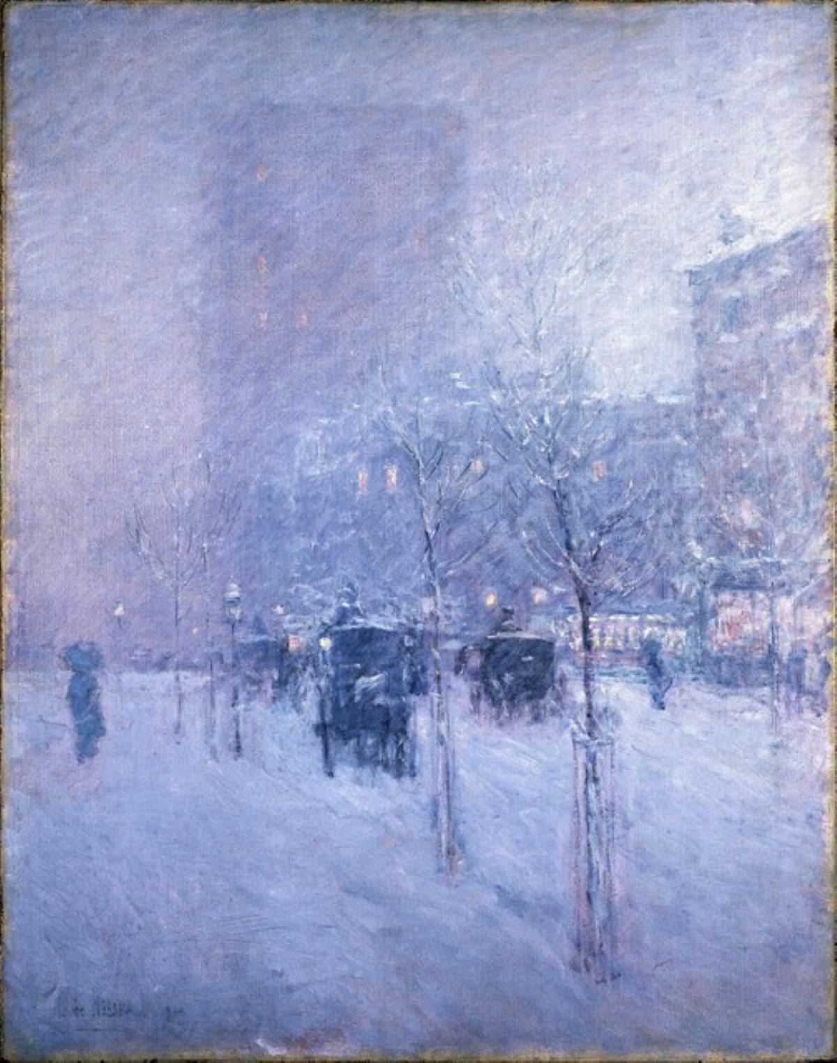 Artist: Childe Hassam - Title: Late Afternoon, New York, Winter - Medium: Fine Art Giclee on Canvas - Image Size: Approximately 32 inches x 25.25 inches - Framed: Unframed on Unstretched Canvas - Biography: Childe Hassam was a leading American impressionist painter and printmaker. The son of a prosperous hardware merchant and antique collector, Hassam (christened Frederick Childe Hassam) was born in 1859 near Boston. In 1872 a great fire in Boston destroyed his father's business, forcing Hassam to leave school. He found a job with a publishing firm, but having little talent for business, he began work as an apprentice to a wood engraver and later created illustrations for such magazines as Harper's and The Century.