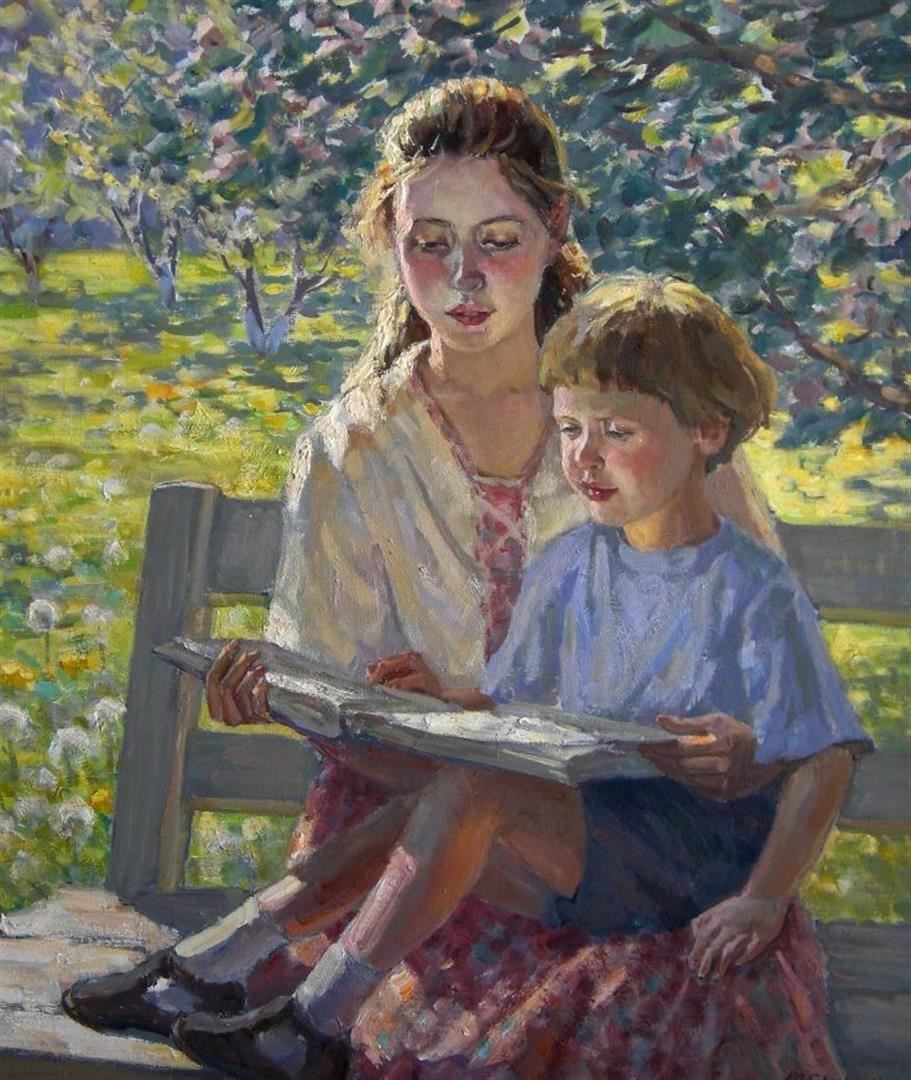 Children in the Garden by Marina Chulovich portrays a women reading to a child on a bench in a garden by lovely trees. The piece is a framed original on canvas with the dimensions of 37 1/2" x 34".