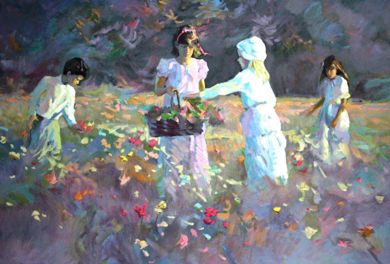 Children in the Meadow by Don Hatfield is a limited edition serigraph showing children picking flowers in the meadow. The size is 35" x 46".
