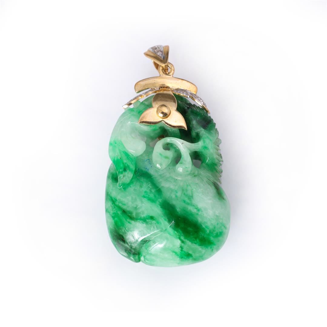 Chinese Carved Jadeite Toggle Mounted in 18K Yellow Gold. Containing fourteen round diamonds weighing approximately 0.10 cts. Total weight of 34.6 gm. Estimated retail value $2,800.