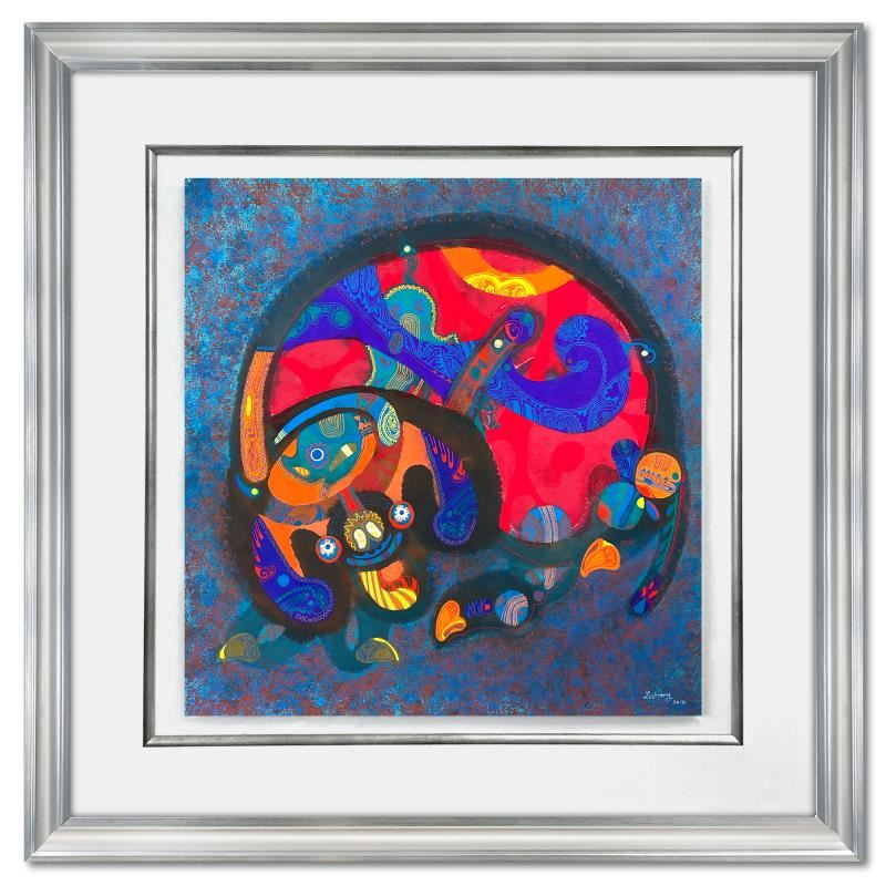 "Chinese Zodiac - Earth Pig" is an original mixed media painting on paper by Lu Hong, hand signed by the artist. This piece comes custom framed. Includes Letter of Authenticity. Measures approx. 31" x 31.5" (frame), 20" x 20" (image).