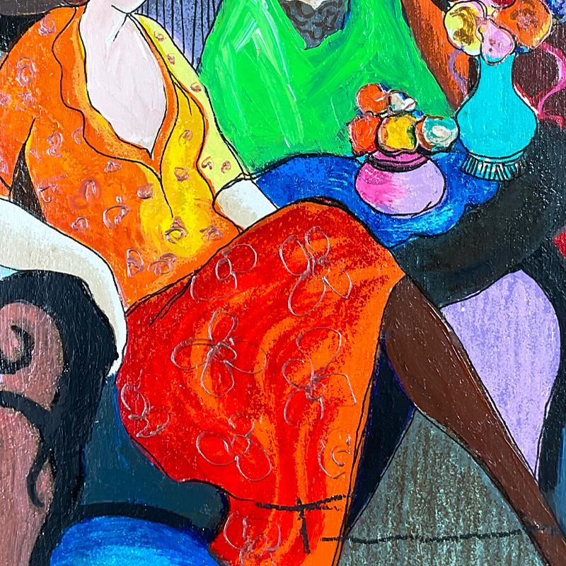 "Chit Chat" is a one-of-a-kind mixed media over paint on wood by Itzchak Tarkay (1935-2012), hand signed by the artist. This piece comes custom framed. Includes Letter of Authenticity. Measures approx. 17" x 15" (frame), 9" x 7" (image).