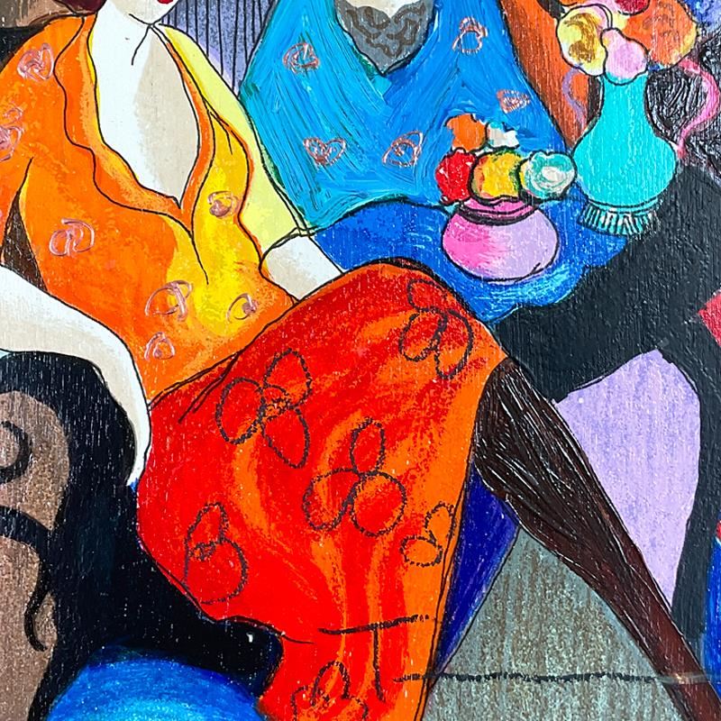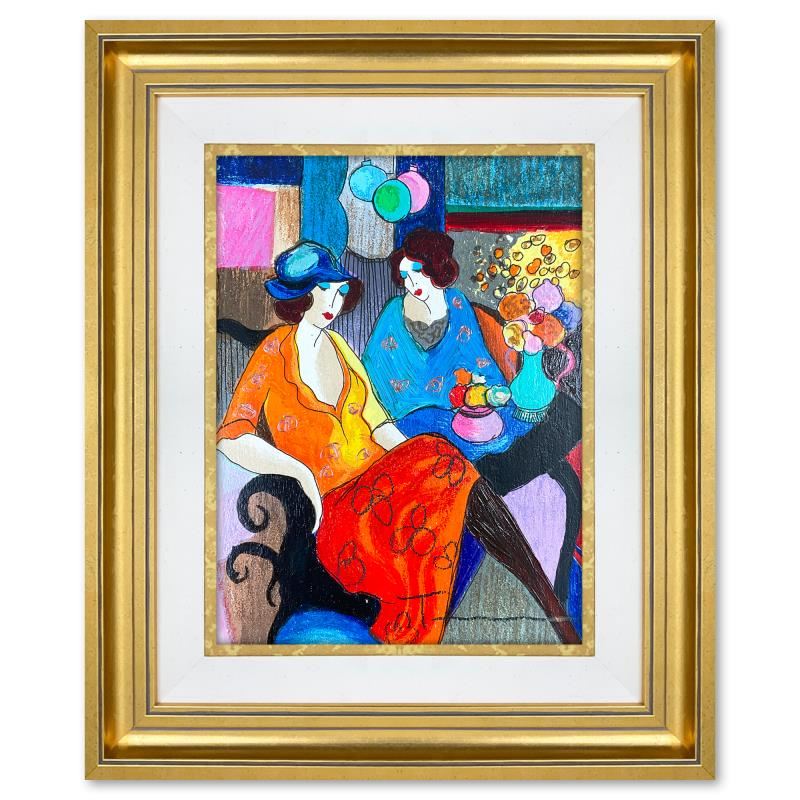 "Chit Chat" is a one-of-a-kind mixed media over paint on wood by Itzchak Tarkay (1935-2012), hand signed by the artist. This piece comes custom framed. Includes Letter of Authenticity. Measures approx. 17" x 15" (frame), 9" x 7" (image). This item requires special handling and may have a longer than usual turnaround.