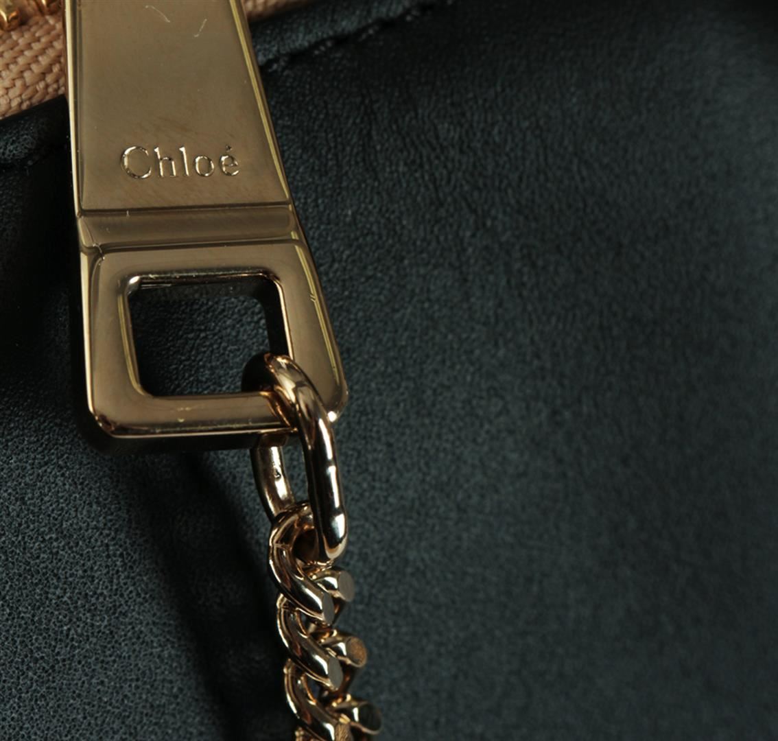 New with tags, Chloe "Baylee" black and gray calfskin shoulder/tote bag featuring: polished pale-gold tone hardware. Lined with fabric; one zip pocket, one card slot and two slip pockets at interior. Rolled top handles; detachable, adjustable shoulder strap. Top two-way-zip closure styled with chain detail. 10" height x 17.0" width x 6.0" depth (approximately). 4" handle drop, 18" maximum strap drop (approximately). Made in Italy. Comes with original Chloe dust bag.