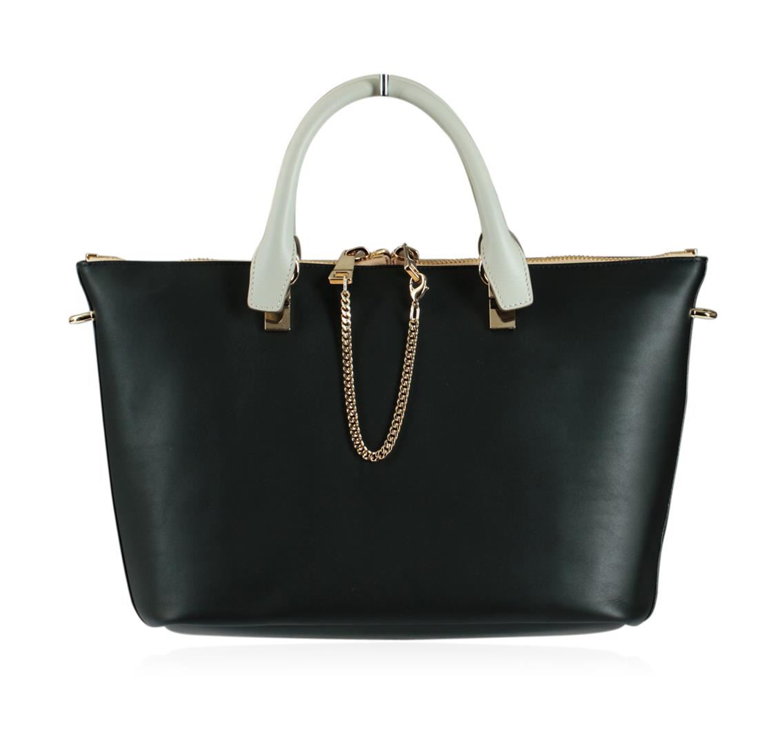 New with tags, Chloe "Baylee" black and gray calfskin shoulder/tote bag featuring: polished pale-gold tone hardware. Lined with fabric; one zip pocket, one card slot and two slip pockets at interior. Rolled top handles; detachable, adjustable shoulder strap. Top two-way-zip closure styled with chain detail. 10" height x 17.0" width x 6.0" depth (approximately). 4" handle drop, 18" maximum strap drop (approximately). Made in Italy. Comes with original Chloe dust bag.