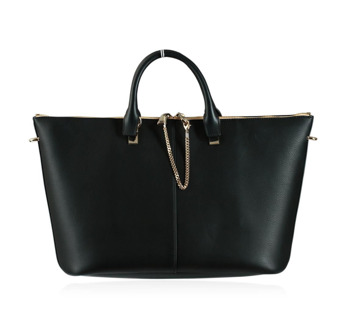 New with tags, Chloe "Baylee" black calfskin tote featuring: polished pale-gold tone hardware. Lined with fabric, one zip pocket, one card slot and two slip pockets at interior. Rolled top handles; detachable, adjustable shoulder strap. Top two-way-zip closure styled with chain detail. 11.5" height x 20.0" width x 6.0" depth (approximately). 4" handle drop, 18" maximum strap drop (approximately). Made in Italy. Comes with original dust bag.