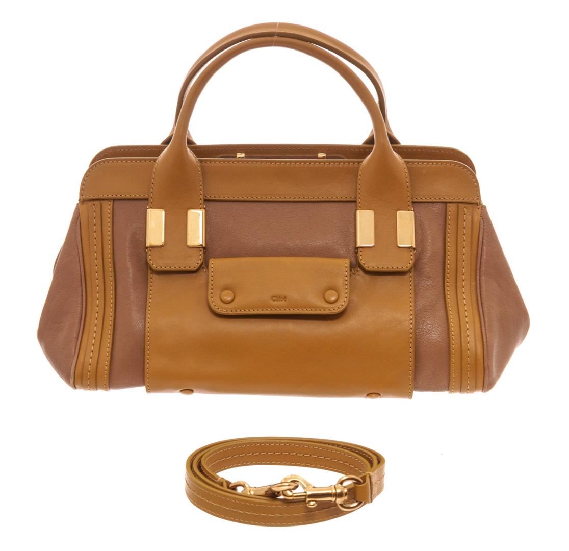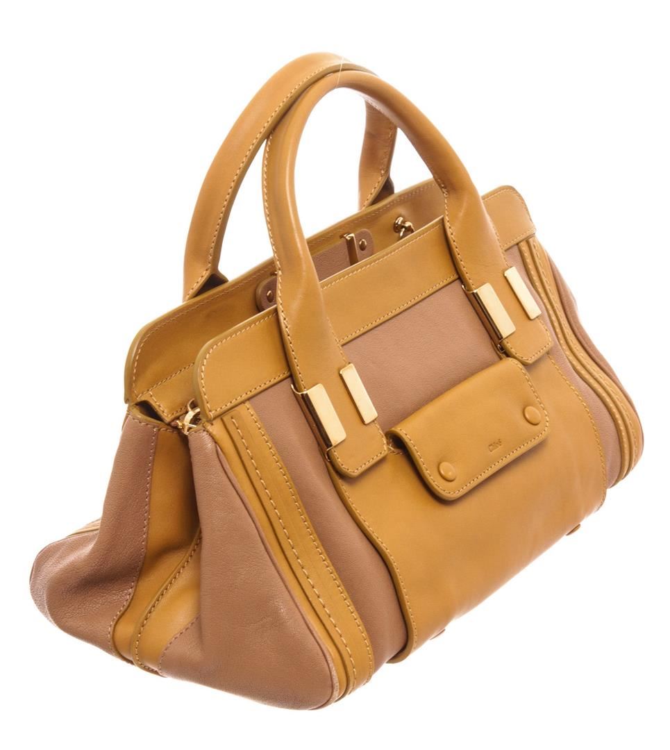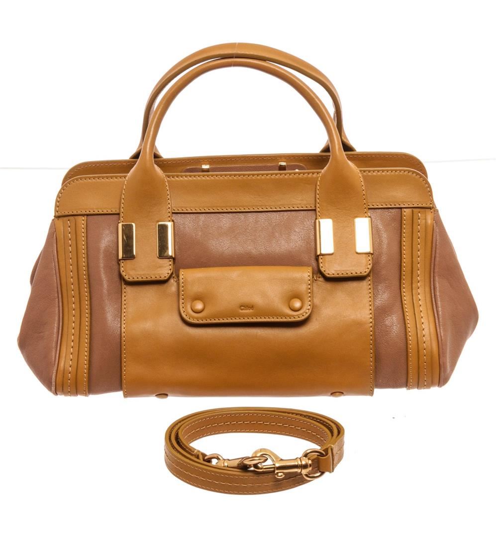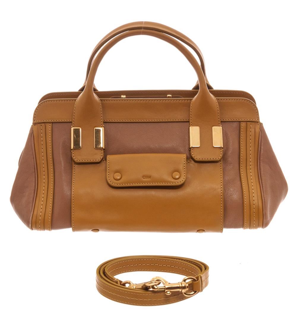 Chloe Brown Leather Alice Shoulder Bag with gold-tone hardware, rolled handles single shoulder strap, dual exterior pockets, twill lining single interior pocket, zip closure.