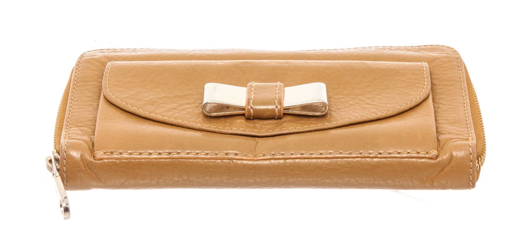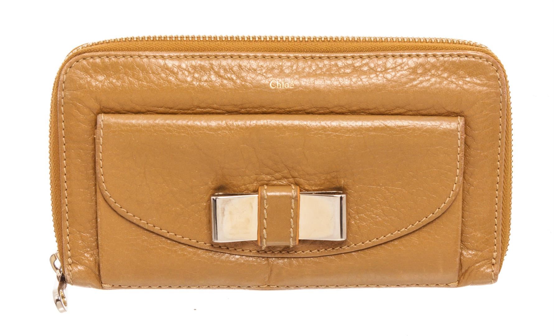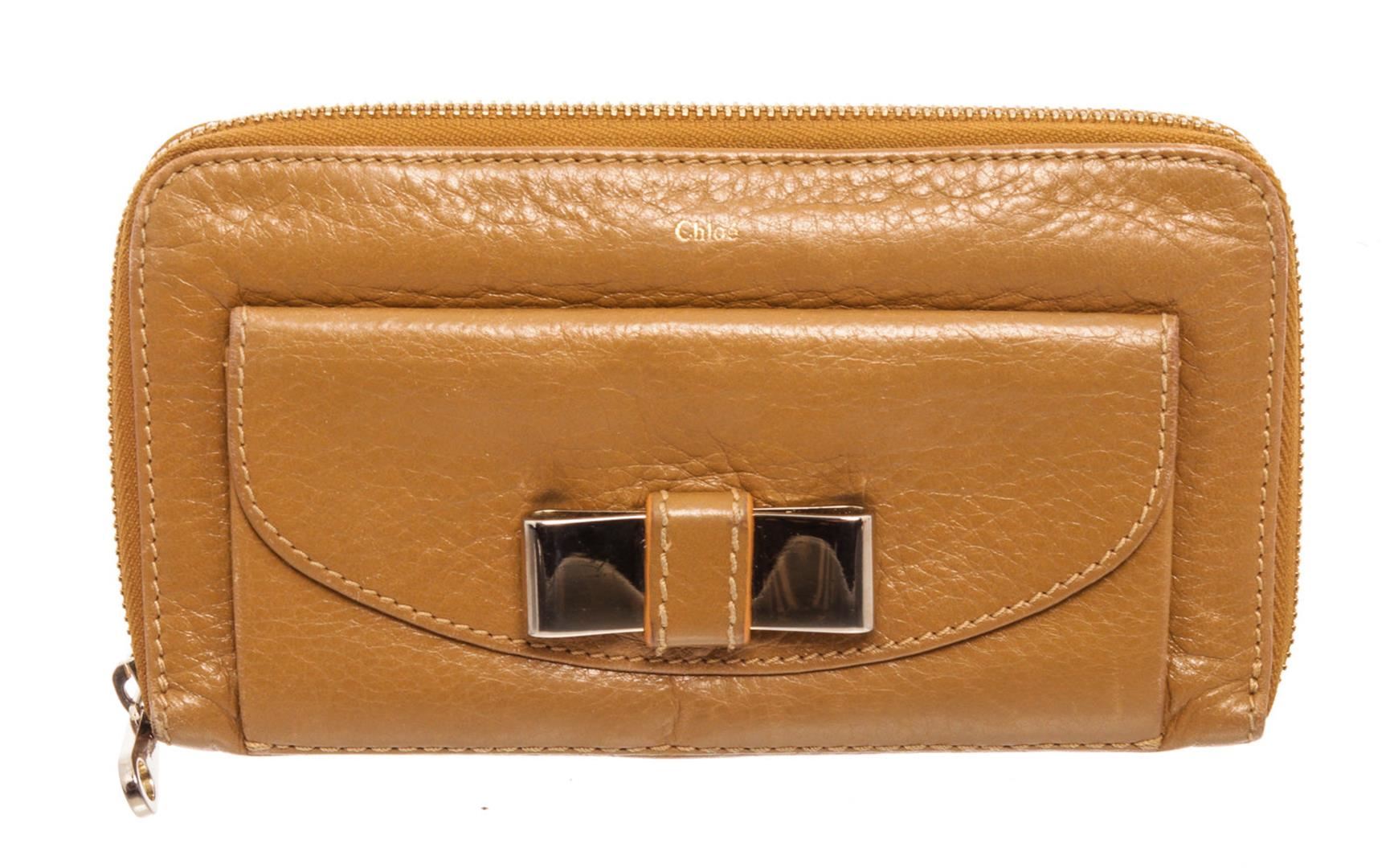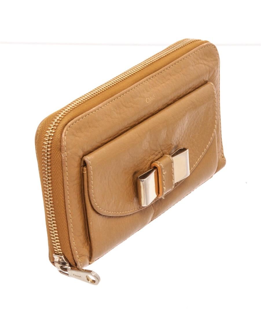 Chloe Brown Leather Lily Zip Wallet with gold-tone hardware, single exterior flap pocket, three interior compartments; one with zip closure, tonal leather and grosgrain lining, dual bill compartments, eight card slots and zip-around closure.